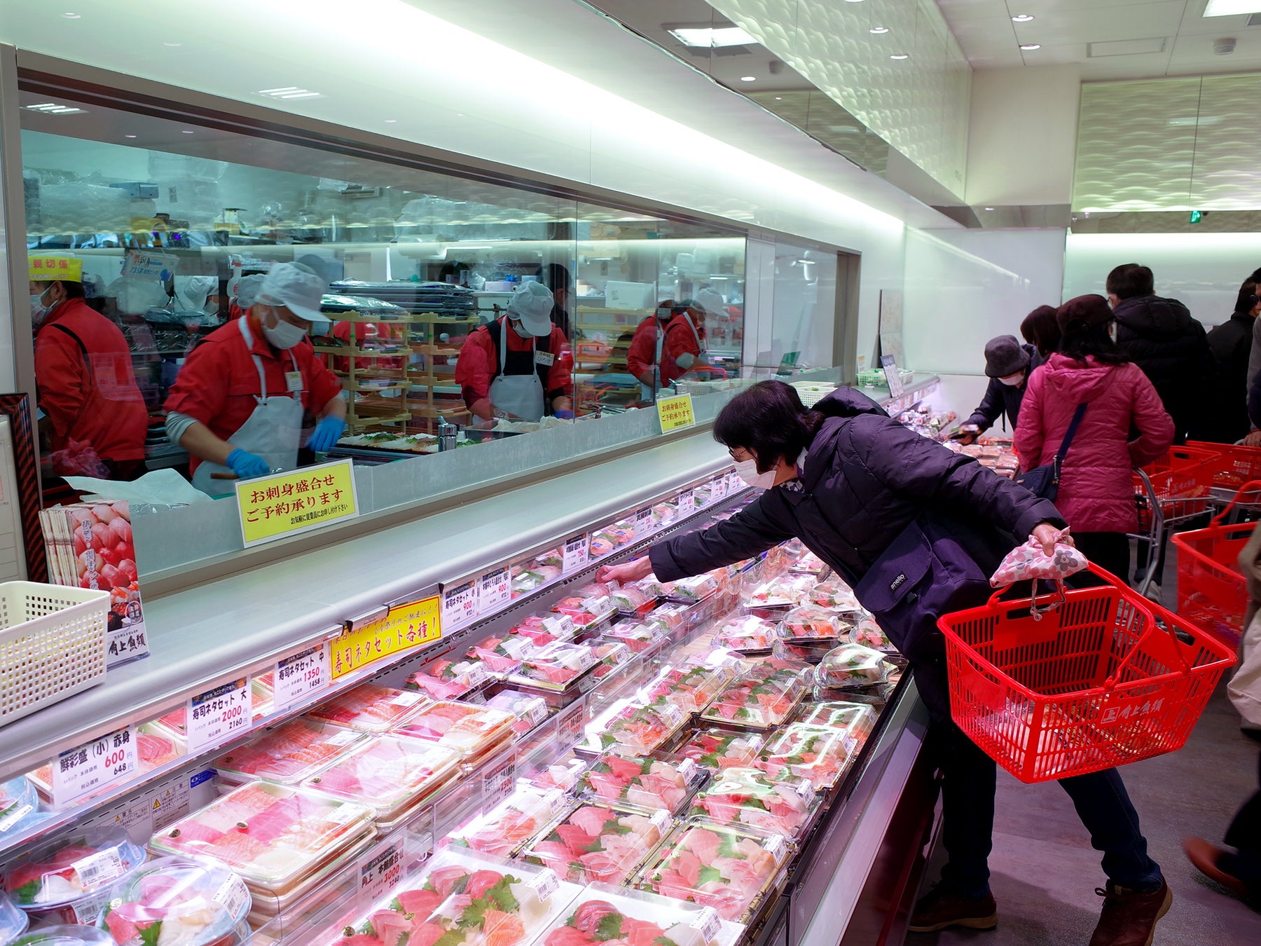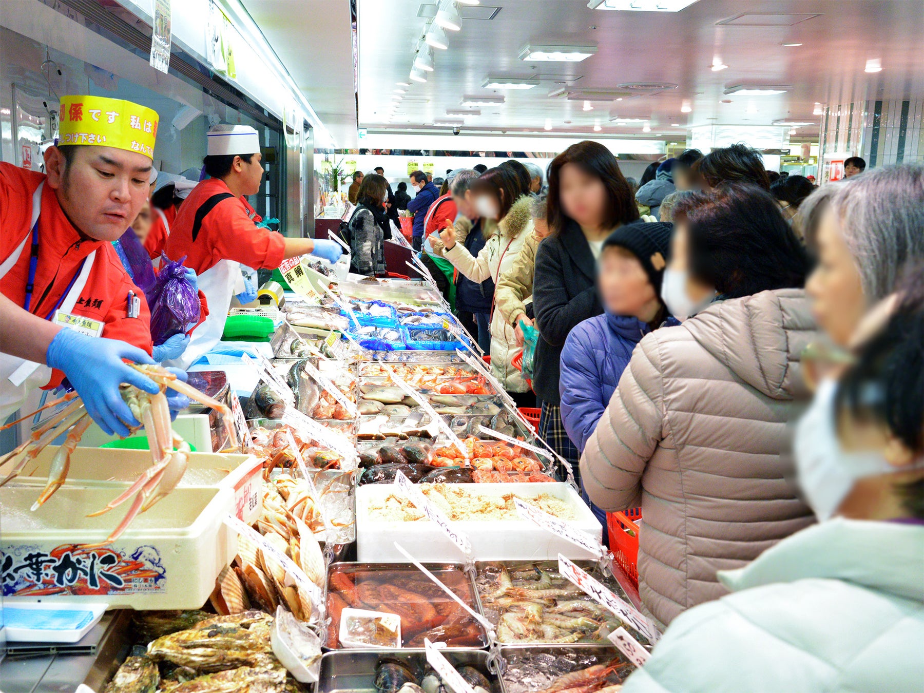 代名詞ともいえる活気あふれる「鮮魚 対面販売」で、幾種類もご用意した丸ごと一尾の鮮魚から店員と直接会話を交わしてご購入いただく楽しみももちろんのこと、刺身、寿司、惣菜、自家製漬魚など600点を超える魚介関連商品を取りそろえて、より一層お客様にお喜び頂ける店舗になるものと自負してございます。