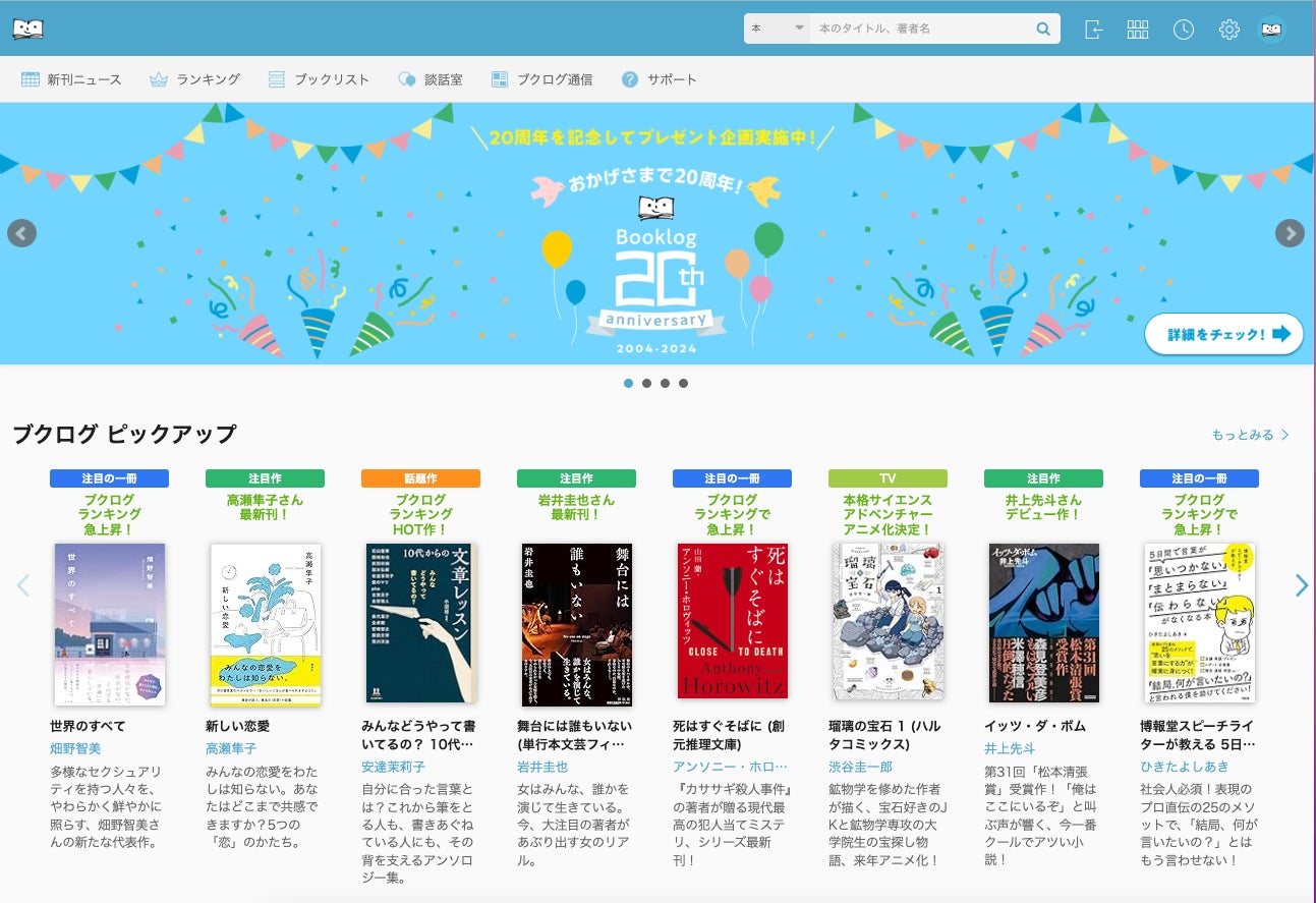 株式会社ブクログ(本社:東京都渋谷区、代表取締役社長:長谷川 孝、以下「当社」)が運営する読書管理サービス「ブクログ」は、2024年9月15日をもって20周年を迎えました。2004年のサービス開始から多くのユーザーにご利用いただき、登録会員数が200万人を突破しております。日頃のご愛用に感謝の気持ちを込めて、ユーザーの皆さまにご参加いただける企画を多数ご用意した20周年特設サイトを開設いたします。