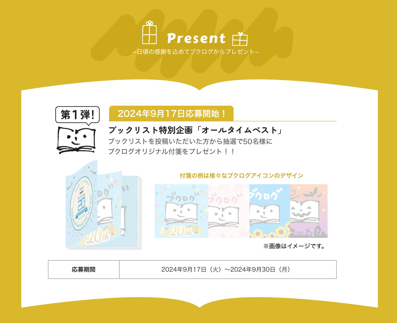 ブクログ内のブックリストに期間中「オールタイムベスト」を投稿していただくと、抽選で50名様にアニバーサリーオリジナル付せんをプレゼント(4柄1種)。