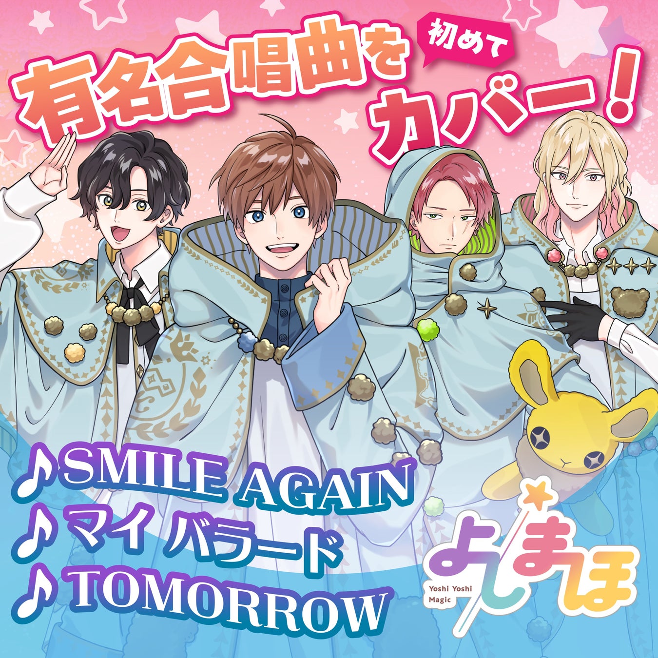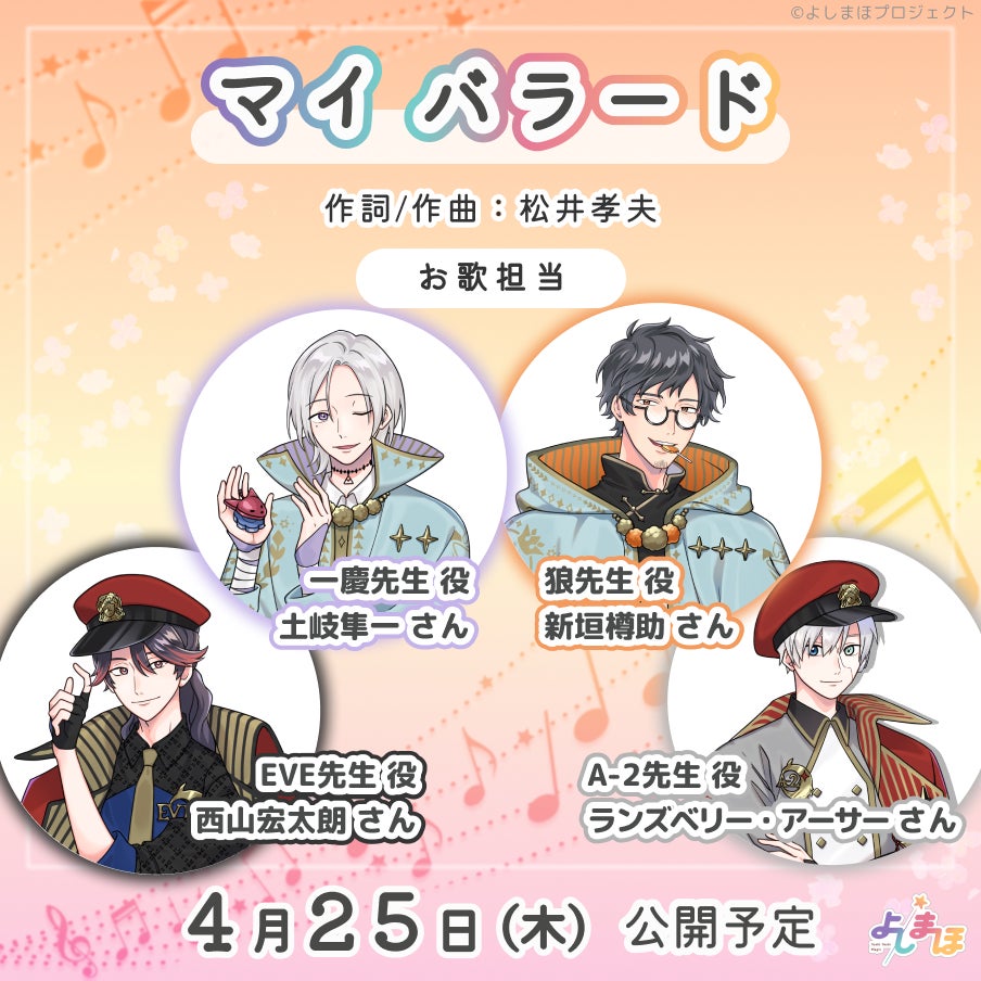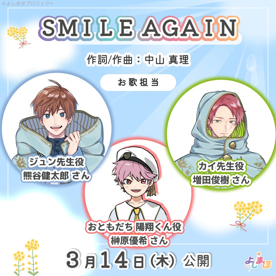 幼児体験アニメ「よしまほ」キャラクター9名によるカバー合唱曲3作品がリリースされることが決定いたしました。 第1弾は、ジュン先生(熊谷健太郎)、カイ先生(増田俊樹)、陽翔くん(榊原優希)3名によるカバー合唱曲『SMILE AGAIN』、2024年3月14日(木)より「よしまほアプリ」内にて公開(プレミアム園児プラン限定:有料)。また、YouTube「よしまほOfficialChannel」では誰でも楽曲の1番を試聴いただけます。