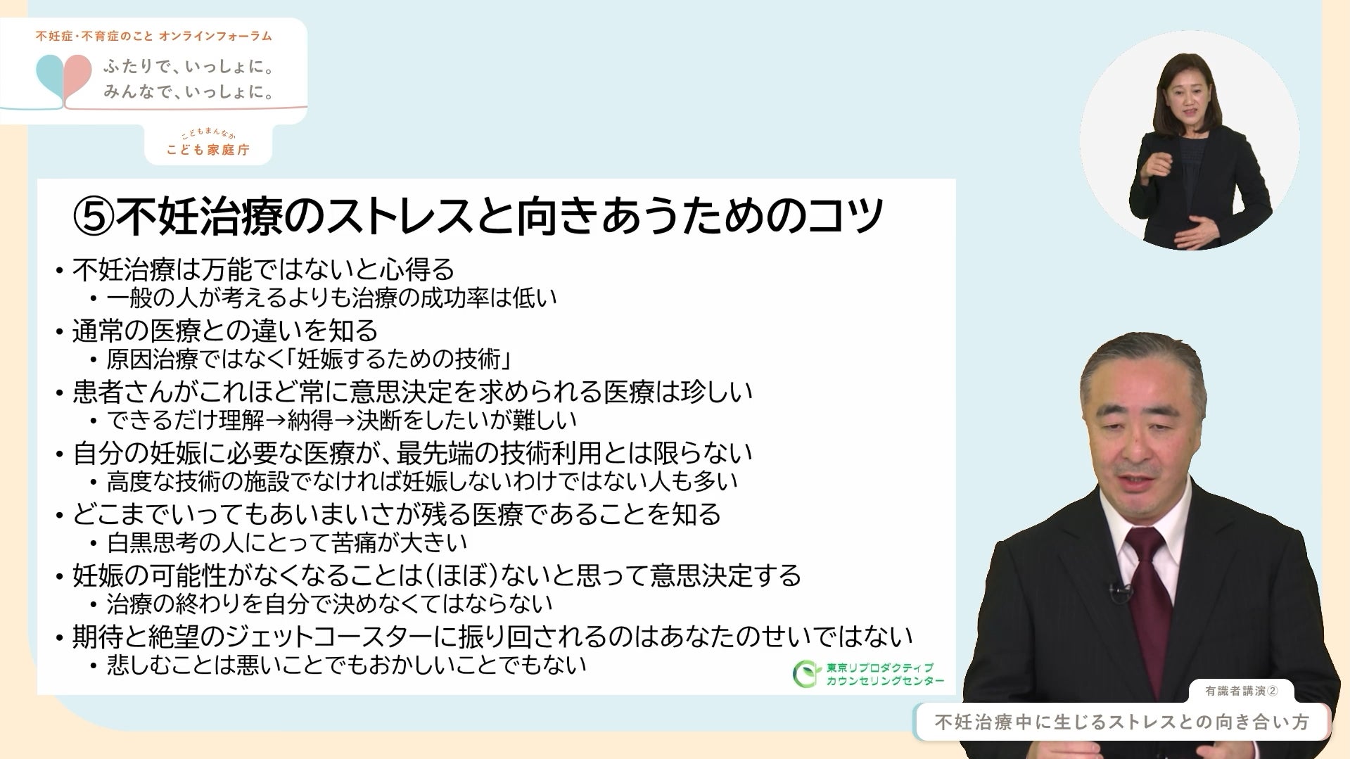 生殖心理カウンセラー(公認心理師・臨床心理士) 平山史朗先生の講演では、不妊治療を始めるタイミングでの夫婦間の意見の不一致やステップアップ時のストレス、男性不妊の治療とストレスが生じやすい3つの場面を例に挙げ、ストレスとどのように向き合うコツをご説明いただきました。