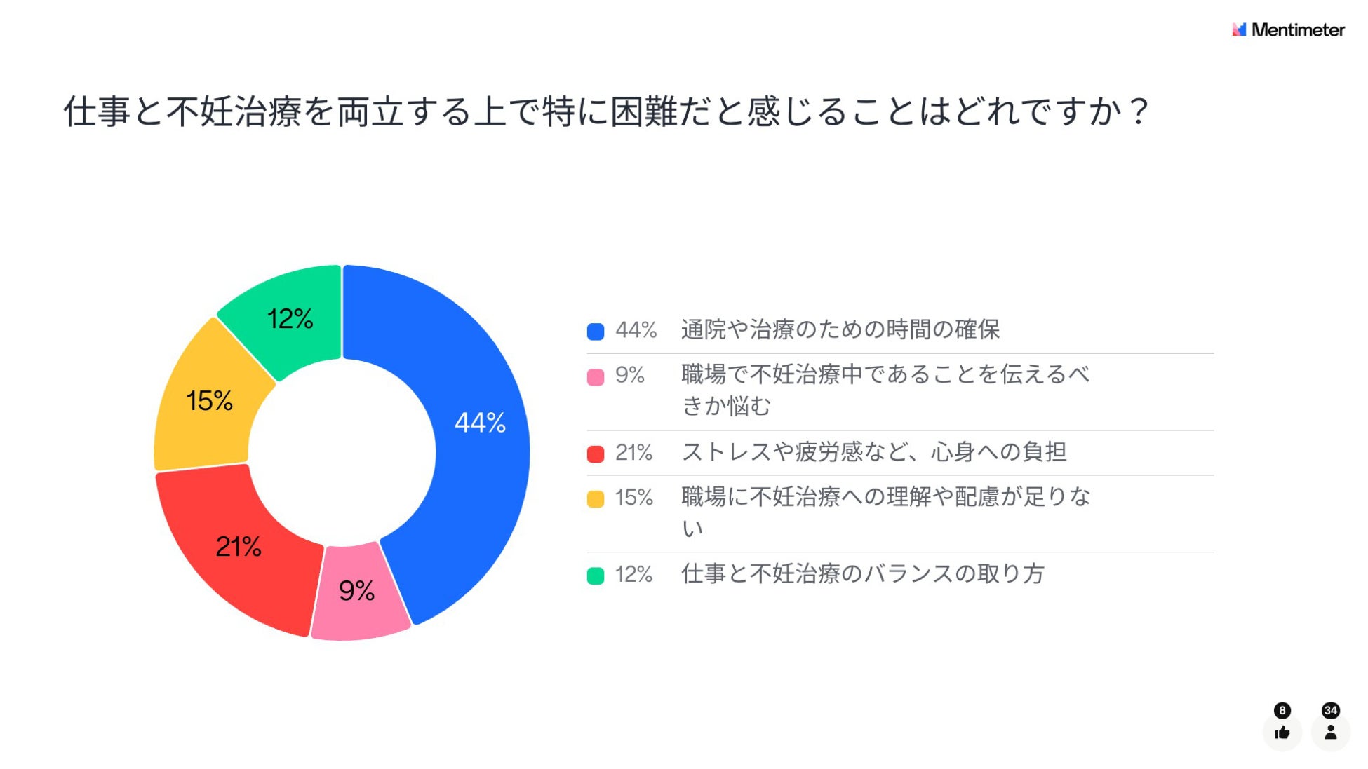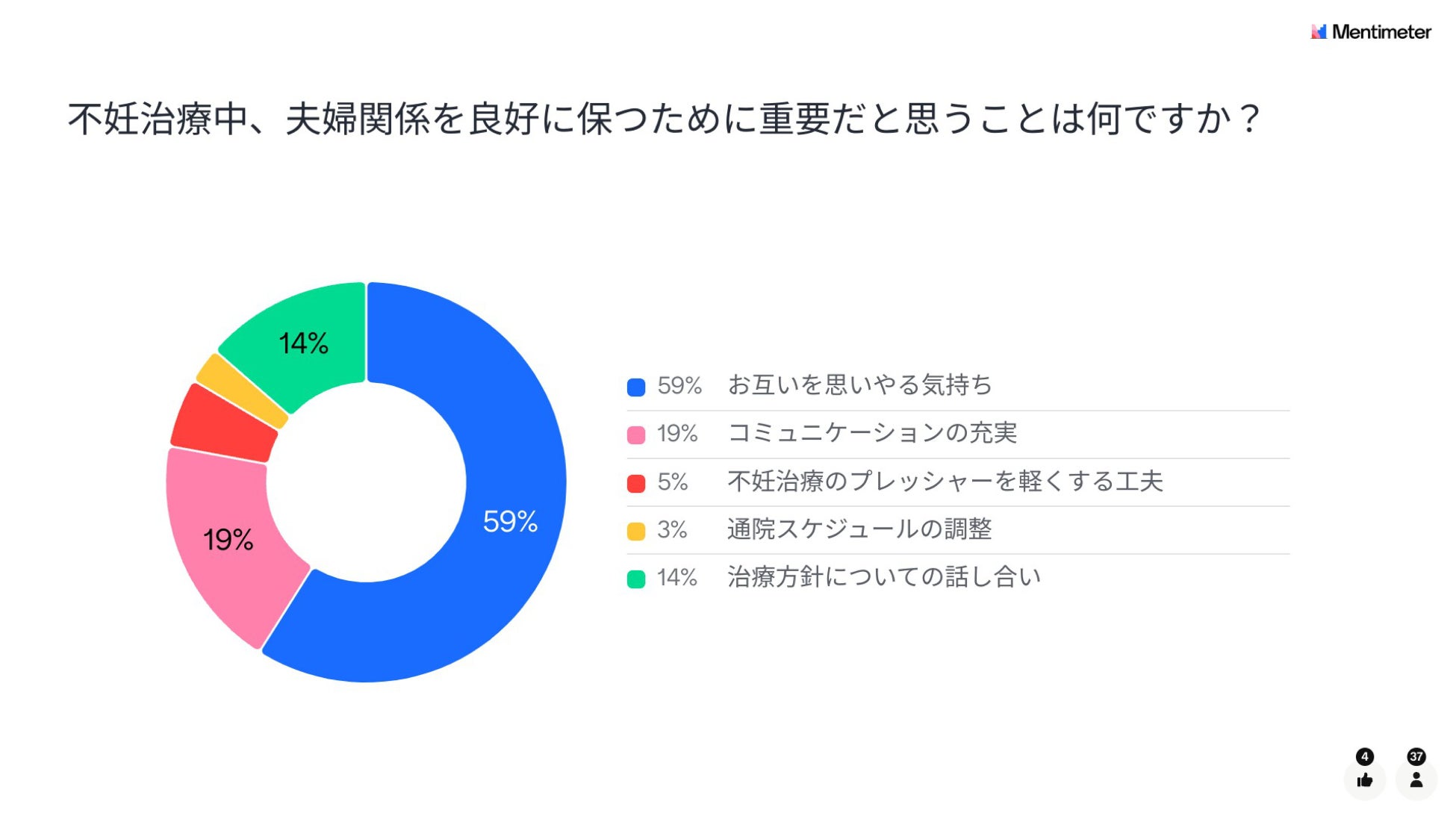 また、視聴者アンケートで上位3つに挙げられた「お互いを思いやる気持ち(58%)」「コミュニケーションの充実(19%)」「治療方針についての話し合い(14%)」の回答を受け、川井先生は「うまく病院を使ってくれたらと思う。日常生活の中で不妊治療の話をすることはお互いにとってプレッシャーになる部分がある。僕ら医師ができることは『夫婦で一度お話を聞きに来てください』とお伝えすること。治療の方向性や伝えるべき事など、お力になれることがあれば伝えていくこともできる」と語り、夫婦間の思いやりや話し合いを支援するために医師をうまく使っていただきたいとご説明いただきました。