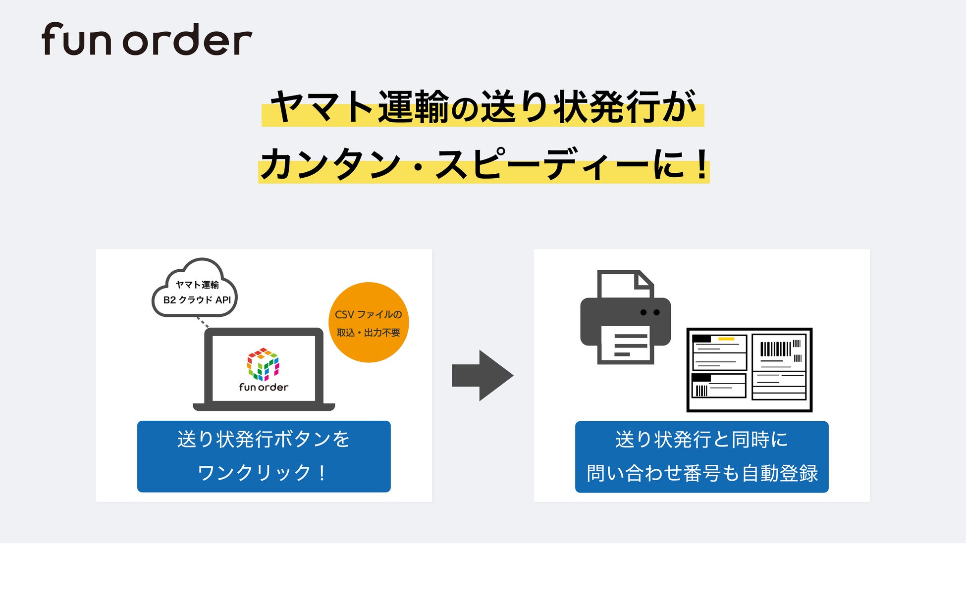 従来は、ヤマト運輸の「送り状発行システムB2クラウド」と「fun order」間でCSVデータの出力および取込作業が必要、で手間と時間がかかっていました。