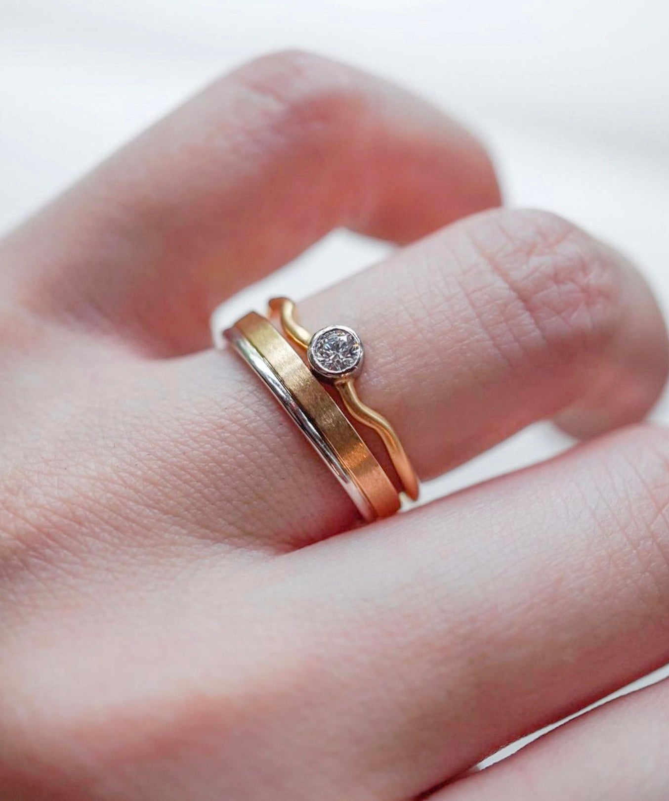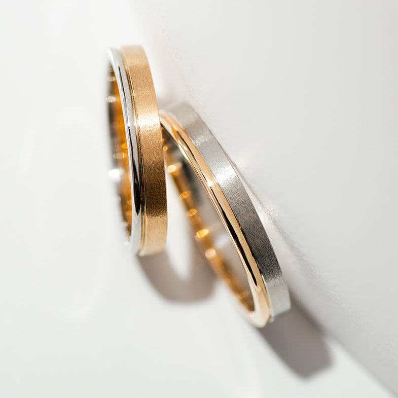 平打ちと丸線のシェイプがなめらかに融合した、コントラストが美しいコンビネーションリング。
