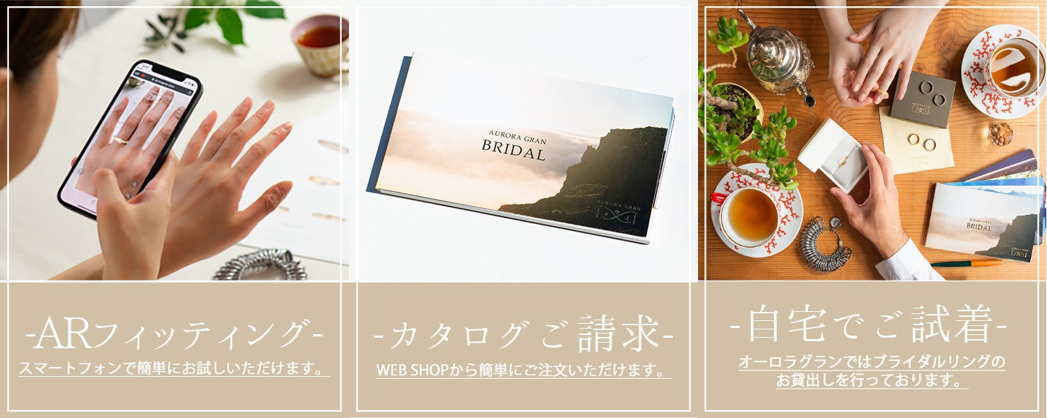 AURORA GRANのブライダルリングがいつでもバーチャルでお試しいただけるスマートフォン専用のサービス、ARフィッティングもお試しください。