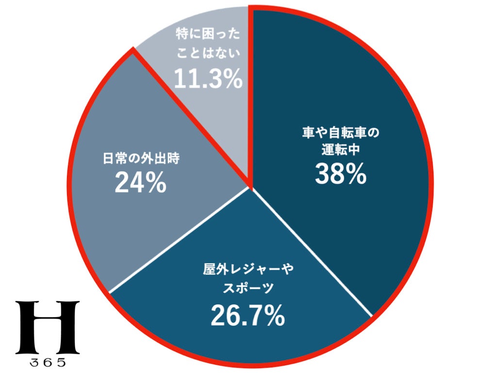 A. 88.7%もの人が、手の日焼けで困ったことがあることがわかりました。一番多かったのが「車や自転車の運転中」(38%)、次に「屋外レジャーやスポーツ」(26.7%)、「日常の外出時」(24%)という結果になりました。やはり季節を問わず紫外線にさらされる手は、うっかり日焼けしてしまうことが多いようです。
