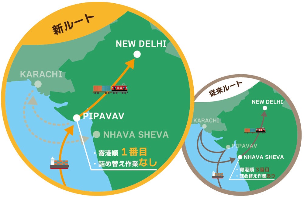 横浜出港船の場合は従来サービスのT/Tが45日のところ、新ダイレクトサービスでは29日、神戸出港船の場合は従来サービスが40日のところ24日に、それぞれ短縮されました。またダイレクト混載便のため、ニューデリー到着までの貨物の位置情報トレースが容易なことも大きなメリットです。