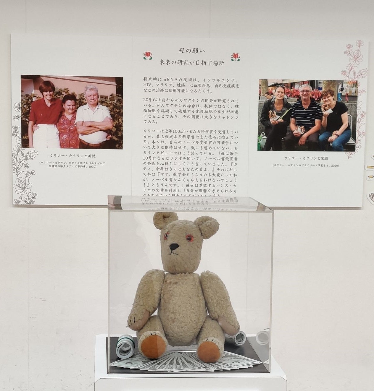 1985年、カリコー博士は家族とともに渡米しました。当時まだ社会主義国だったハンガリーからは外貨を自由に持ち出すことができなかったため、彼女は2歳の娘のテディベアにドル紙幣を縫い込み、このお金でアメリカでの生活を始めました。この記念すべきテディベアのレプリカを展示いたします。