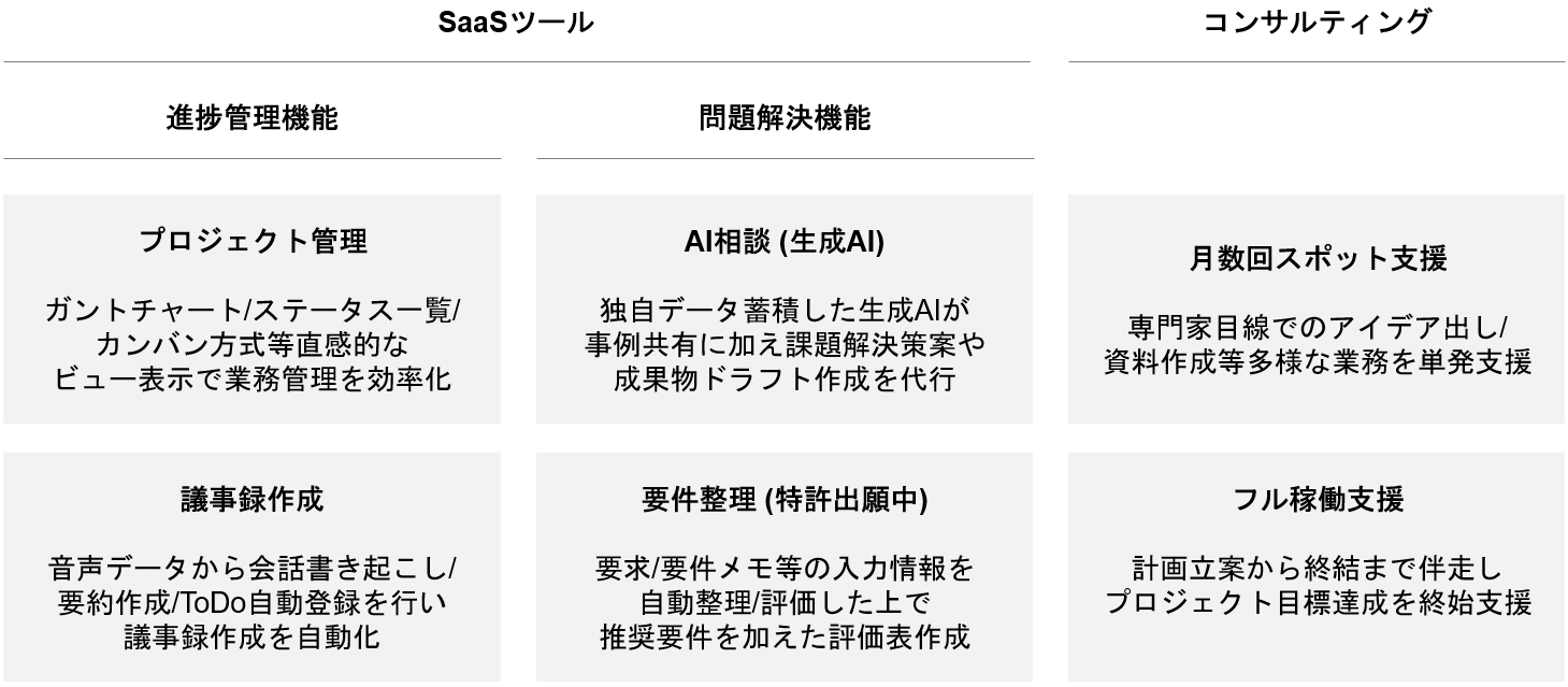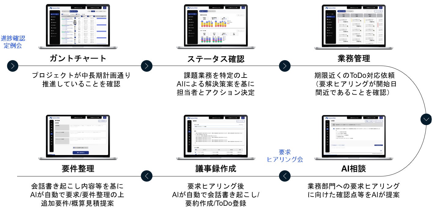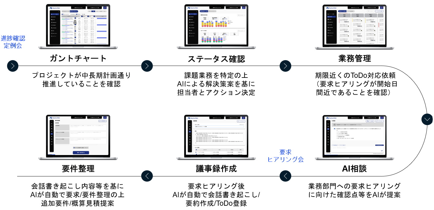 AIが要求/要件整理、概算見積、事例収集等多くの上流工程業務を自動化することに加え、社内データ連携や独自プロンプトガイド機能等によりAIから課題に対する質の高い解決策を取得できる仕様にしています。更に直感的で操作しやすいプロジェクト管理機能が、全ユーザの厳格な業務管理を実現します。