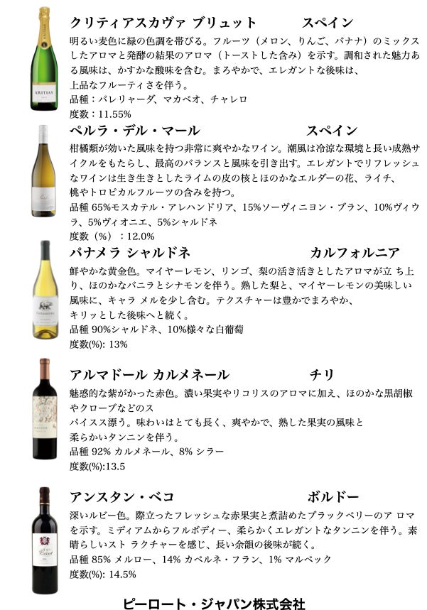 ワインは、大手ワイン商社ピーロートジャパン社と株式会社ユウ・コーポレーションの2社が厳選した10種類ワイン(フランス産・スペイン産・モルドバ共和国産・カルフォルニア産・チリ産)からご用意しました。