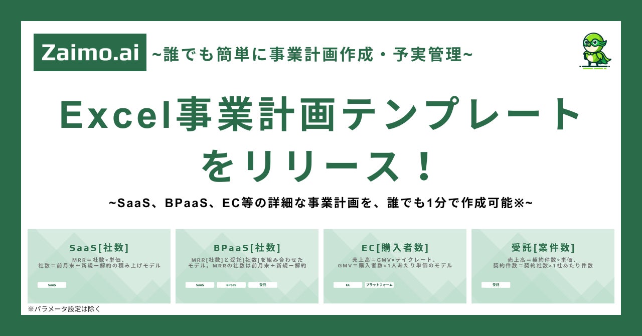 サンプルBPaaS事業計画リンク付|AI経営管理SaaS「Zaimo․ai」、新機能「Excel事業計画テンプレート」をリリース。ビジネスモデル毎の事業計画テンプレで、誰でも簡単に事業計画作成が可能に