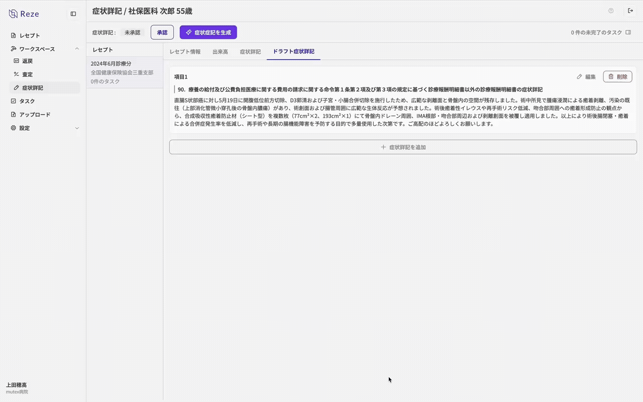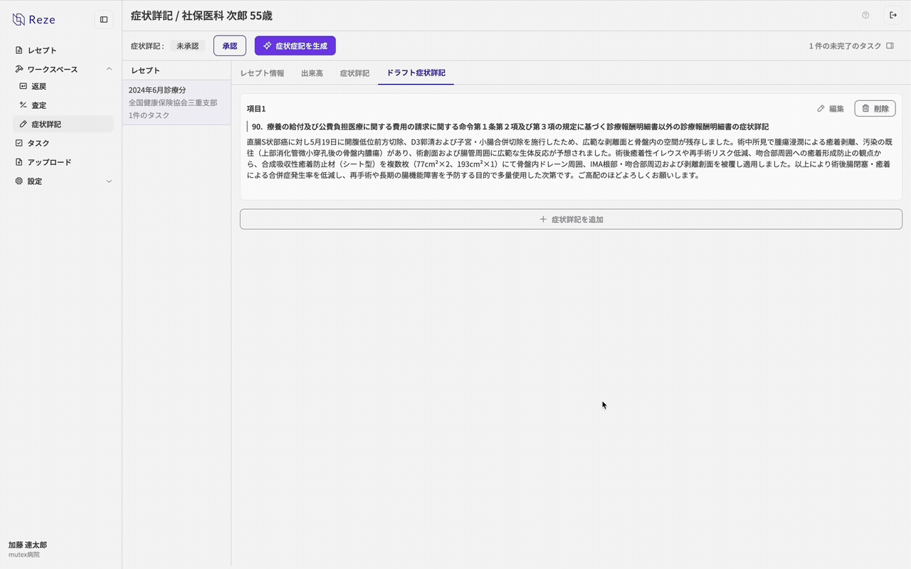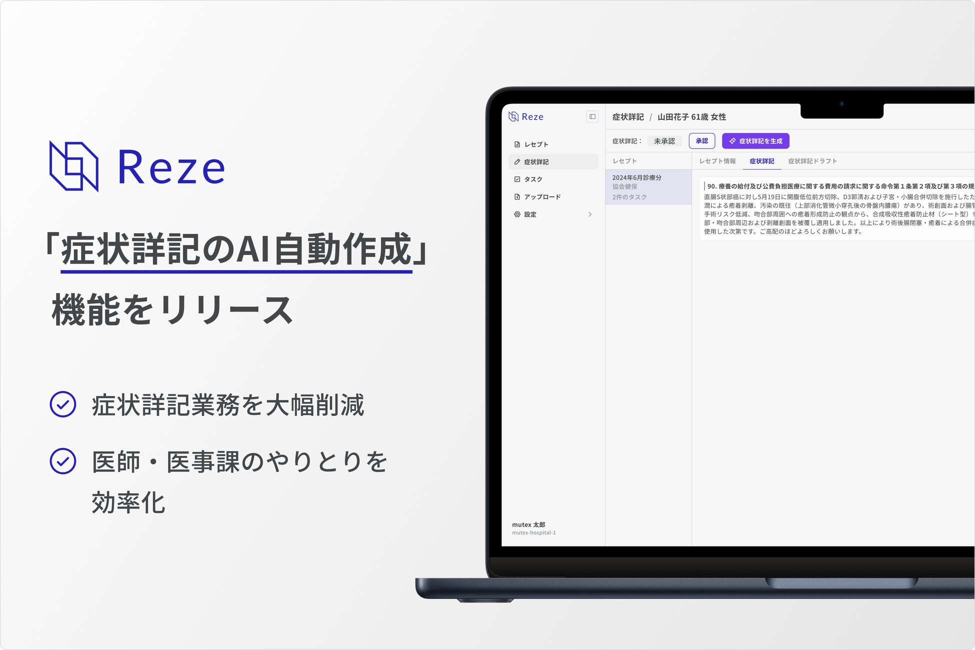 株式会社mutex(本社:東京都文京区、代表取締役:熊澤 洸平)は、医療機関向けAIレセプト管理SaaS「Reze(レゼ)」において、「症状詳記」を自動生成するAI機能を正式リリースしました。本機能により、症状詳記の記載作業を大幅に効率化するとともに、医師・医事課のコミュニケーションコスト削減を支援します。