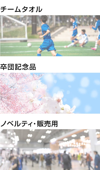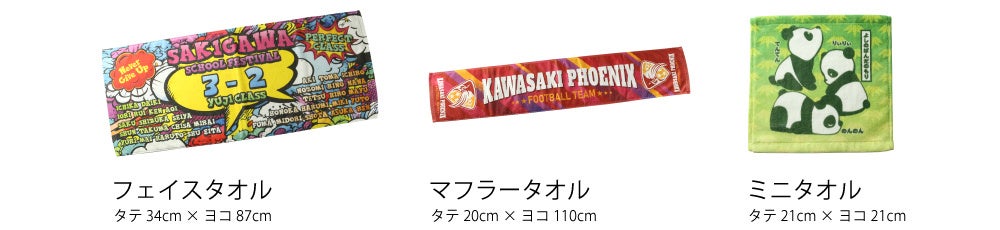 スポーツチーム、サークルのお揃いタオルや記念品用、企業イベントのノベルティ・販売用グッズとしておすすめです。