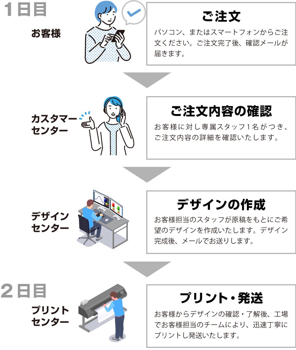 「ワンデイタオル」は、ご注文日の翌日に発送することができます。プリント商品は、お客様の必要なタイミングでお届けすることが一番重要です。効率化を徹底したオペレーションにより、お客様のご希望日に必ずお届けすることを実現しました。どのようなお届け日でも別途料金をご請求することはありません。 お急ぎの場合でも、デザインの修正は何度でも無料で承りますのでご安心ください。