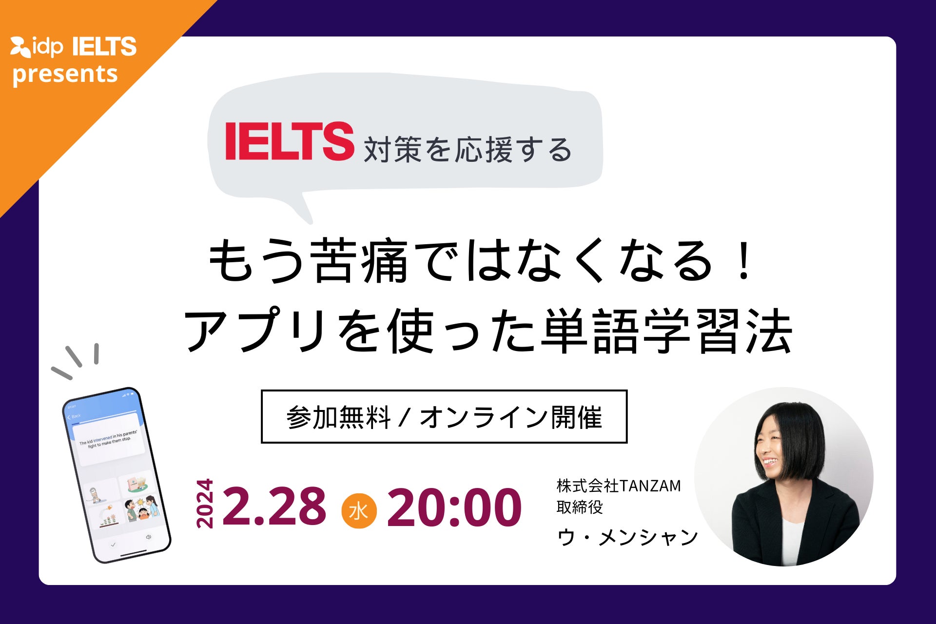 株式会社TANZAM(本社:東京都中央区、代表取締役:柴崎亮)は、2024年2月28日(水)、全世界での年間受験者数が400万人を超える、グローバルな英語4技能試験「IELTS(アイエルツ)」を運営するIDP Education 社(本社:オーストラリア・メルボルン、代表取締役:Tennealle O'Shannessy、以下IDP)主催の無料オンラインセミナーに登壇し、「もう苦痛ではなくなる!アプリを使った単語学習法」をお届けします。取締役ウ・メンシャンが講師となり、効果的な単語学習方法について解説します。