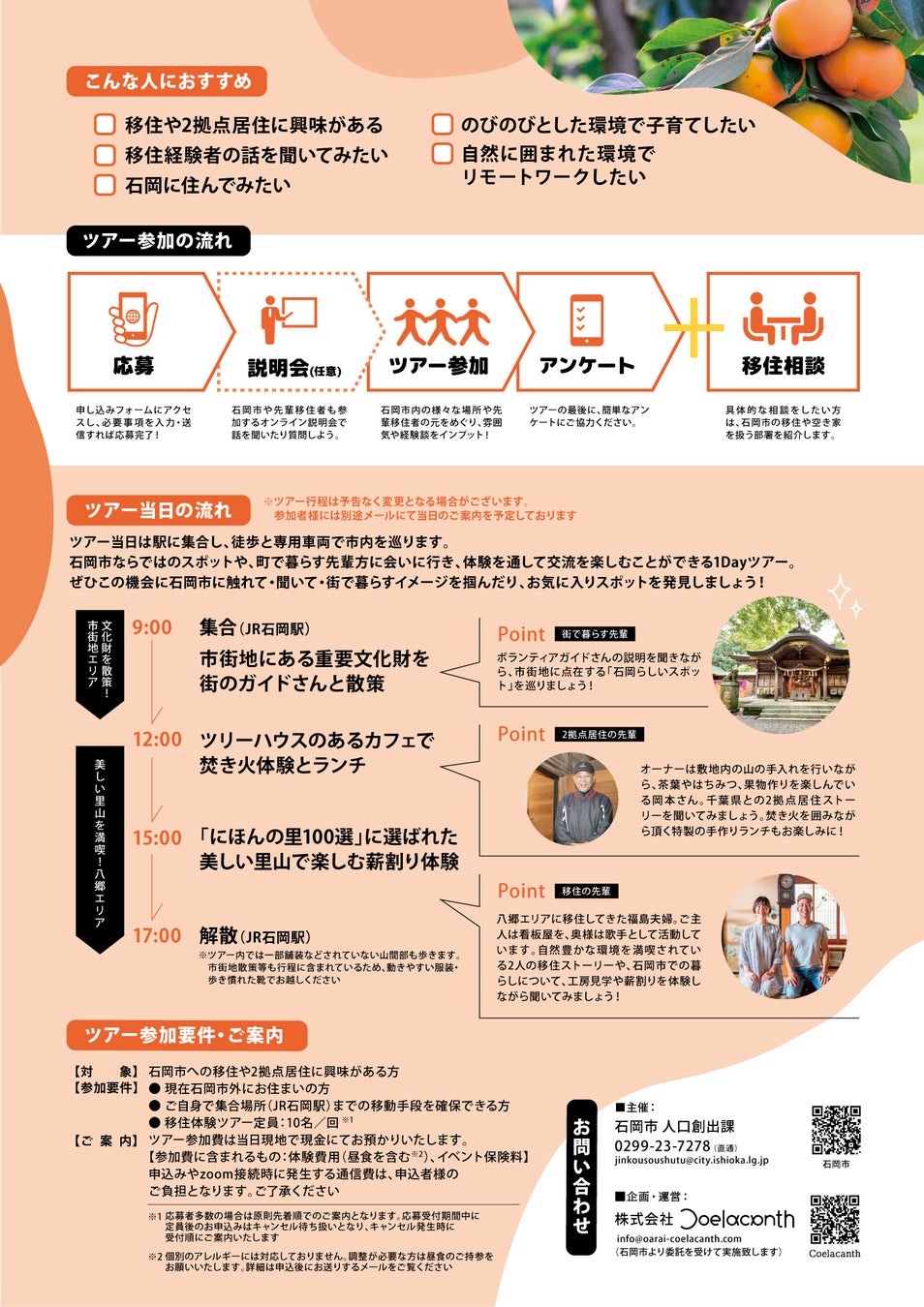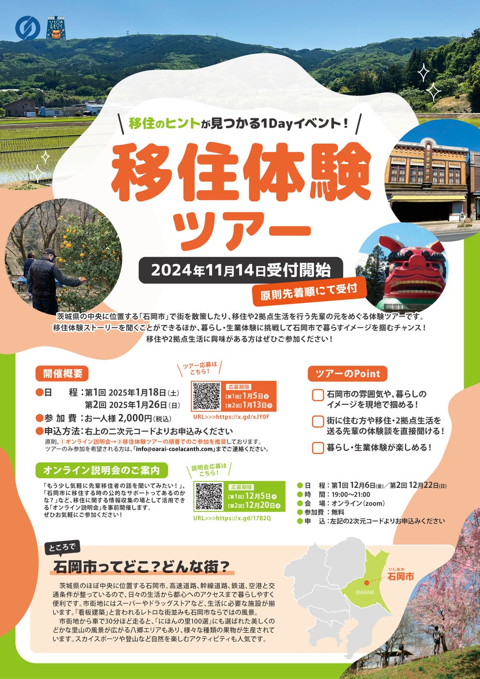 茨城県石岡市と、茨城県を中心に「地域から価値をつくる」ことを掲げ活動する、株式会社Coelacanth(シーラカンス)(本社:茨城県東茨城郡大洗町、代表:佐藤 穂奈美 以下「当社」)は、石岡市移住推進事業の一環として、「移住体験ツアー(全2回)」を開催いたします。