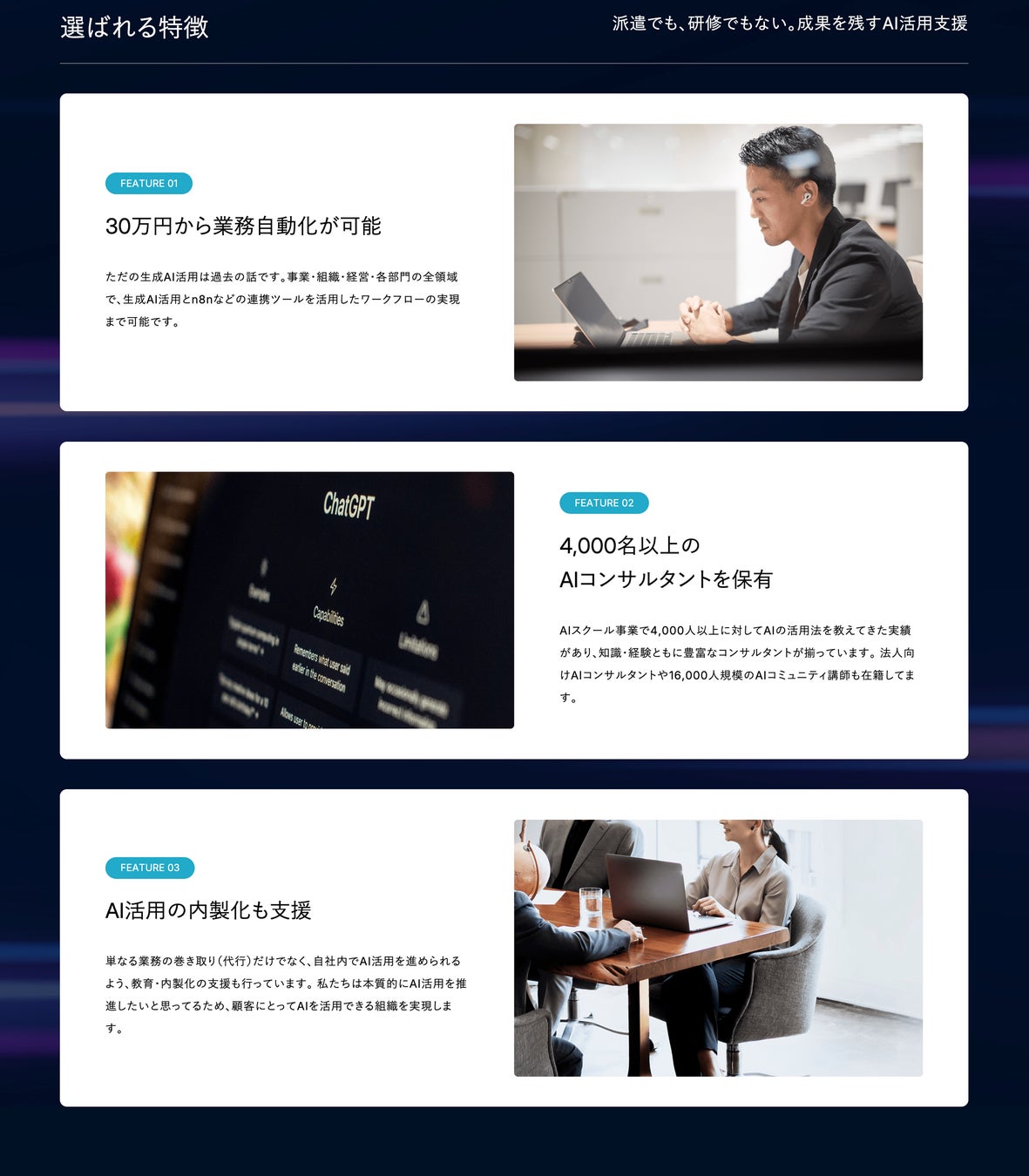 コンサルタントが机上のアドバイスで終わらず、現場で業務フローにAIを組み込むところまで伴走します。 -