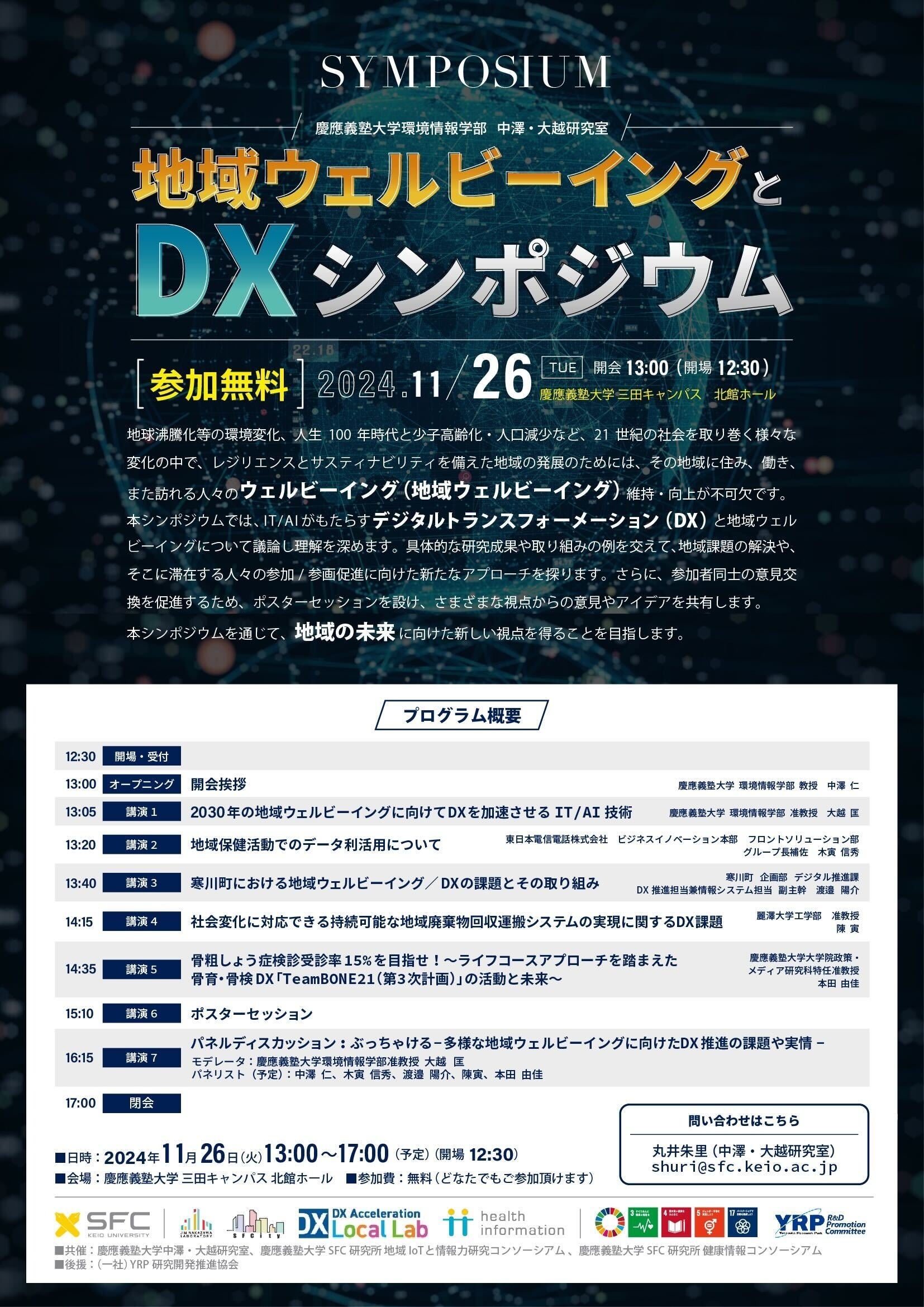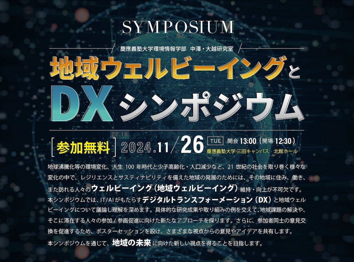 慶應義塾大学環境情報学部中澤・大越研究室、慶應義塾大学SFC研究所地域IoTと情報力研究コンソーシアム、および慶應義塾大学SFC研究所健康情報コンソーシアムは、2024年11月26日午後、慶應義塾大学三田キャンパス北館ホールにて、「地域ウェルビーイングとDX」シンポジウムを開催いたします。