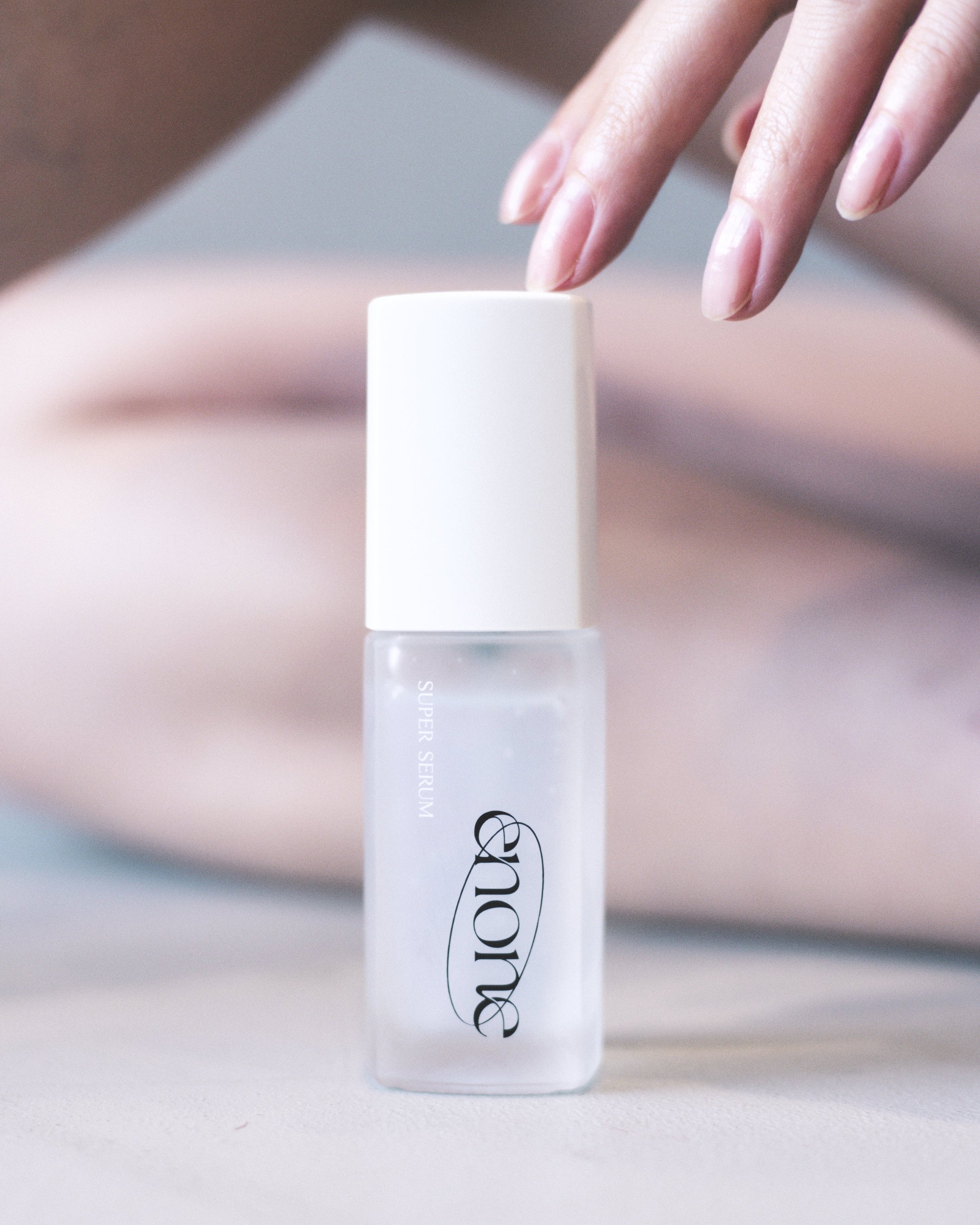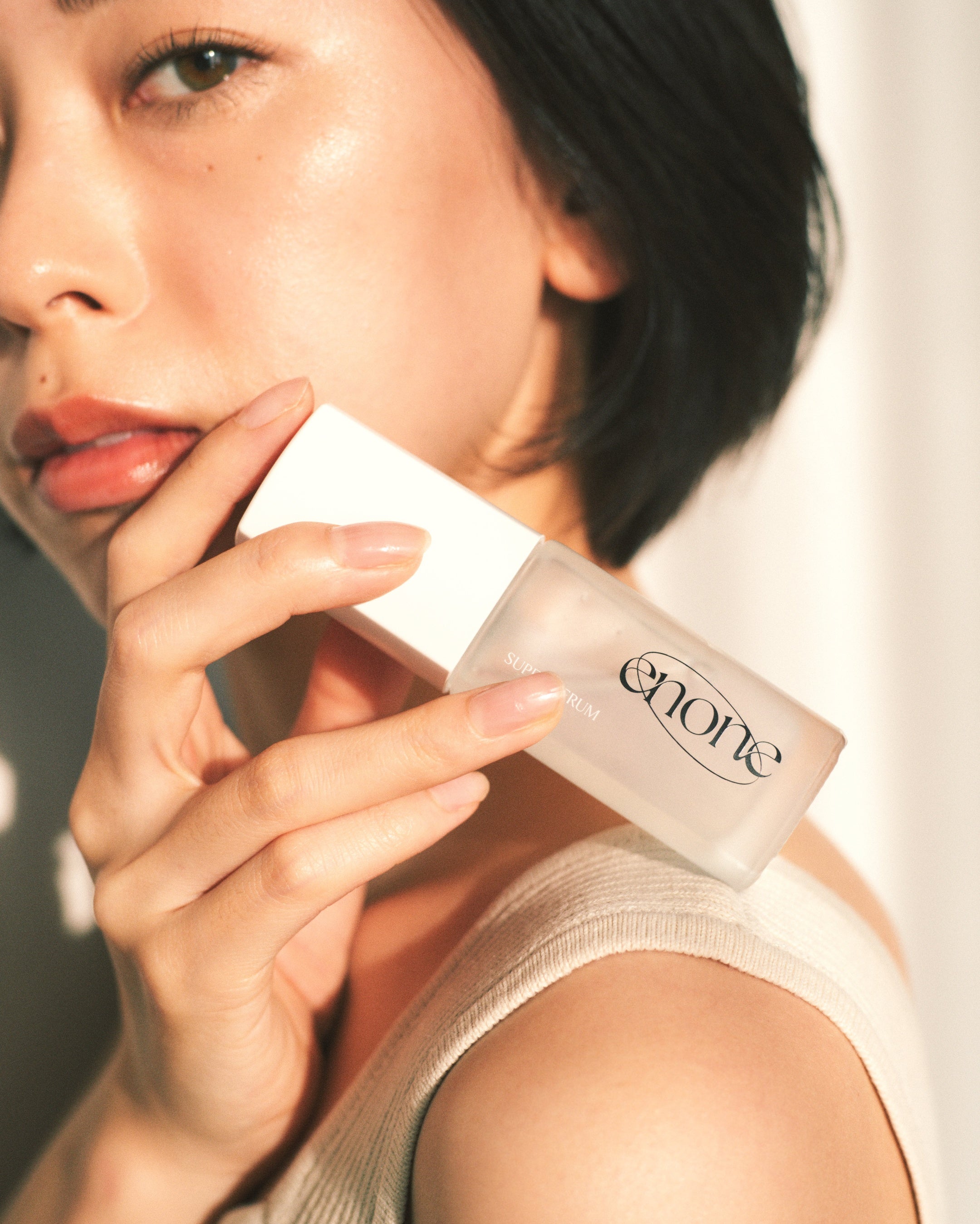私自身、普段から2人の子育てと仕事をしながら、どうしてもスキンケアの時間をゆっくり取れず、いくつもアイテムを重ねることが難しいと感じていました。1本で完結できるものが欲しい。エイジングケアと潤い美肌のスキンケアを目指してつくりました。ブランド名の「enone」は、W (double)-ONLY one。1本の製品で全てが完結する思いから、oを起点にoneを組み合わせて女性的なネーミングの「enone」にしました。円形のブランドロゴは、皆さんと「enone」が一つの縁で繋がり、共に美の旅を歩むイメージを表現しています。