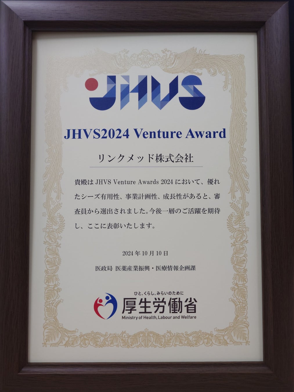 リンクメッド株式会社(代表取締役社長:吉井 幸恵、本社:千葉市、以下「当社」)は、厚生労働省(医政局医薬産業振興・医療情報企画課 医薬品産業・ベンチャー等支援政策室)主催の「JHVS Venture Awards 2024」において「JHVS Venture Award」を受賞したことをお知らせいたします。