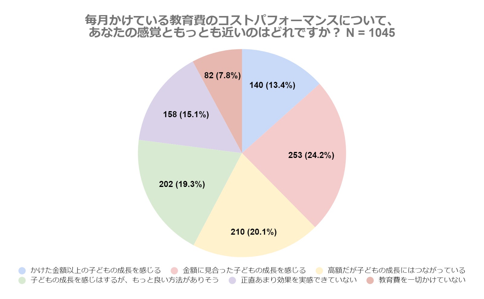 子どもがいる家庭の父母1045名を対象に「教育費のコストパフォーマンスについてどう感じていますか?」とアンケートを取ったところ、「金額に見合った子どもの成長を感じる」という回答が1045名中253名(24.2%)で最多となり、次いで「高額だか子どもの成長にはつながっている」が210名(20.1%)、「子どもの成長を感じはするが、もっと良い方法がありそう」が202名(19.3%)、「正直あまり実感できていない」が158名(15.1%)、「かけた金額以上の子どもの成長を感じる」が140名(13.4%)、「教育費を一切かけていない」が82名(7.8%)という結果になりました。