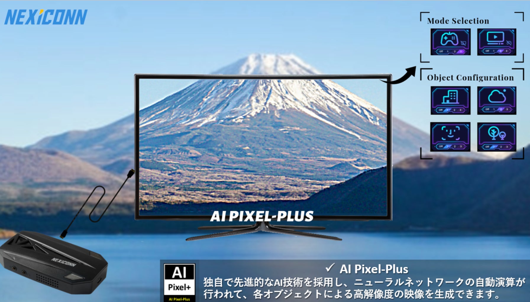 「NEXiCONN」の専用アプリケーションと組み合わせて使えば、PC/NBでNV501/NV601を制御し、最適な管理を行うことができます。これにより、アプリにおいてAIの超解像技術ではもっと簡単に利用、画質調整の切り替えやユーザーカスタム設定の作成できるようになります。