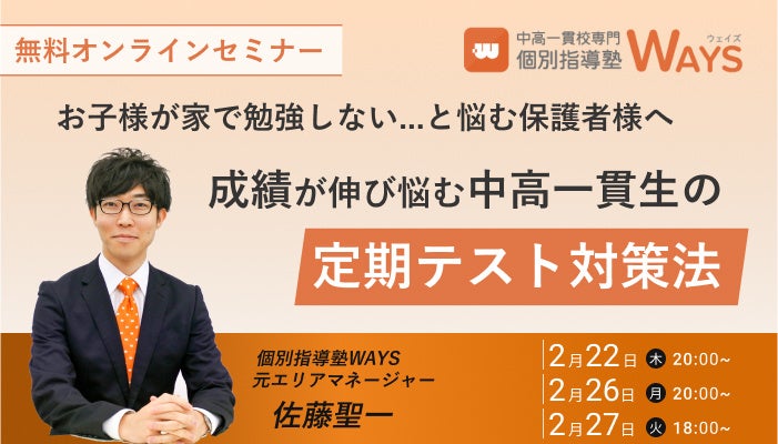 株式会社メイツ(本社:東京都新宿区 代表取締役社長:遠藤尚範)が運営する、『中高一貫校専門 個別指導塾WAYS』は、中高一貫校の定期テスト対策をテーマに無料オンラインセミナーを開催いたします。
