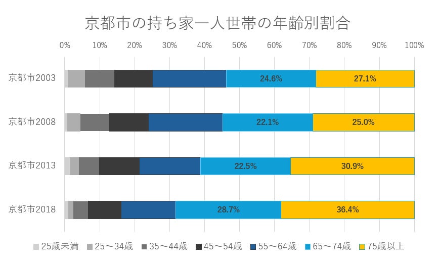 特に「空き家予備軍」と呼ばれる65歳以上の持ち家一人世帯の増加は深刻であり、京都市でも65歳以上、特に後期高齢者(75歳以上)が居住(所有)する「空き家予備軍」が近年目に見えて増加し、年齢別で見ると65%にまで達しています(図表参照)。