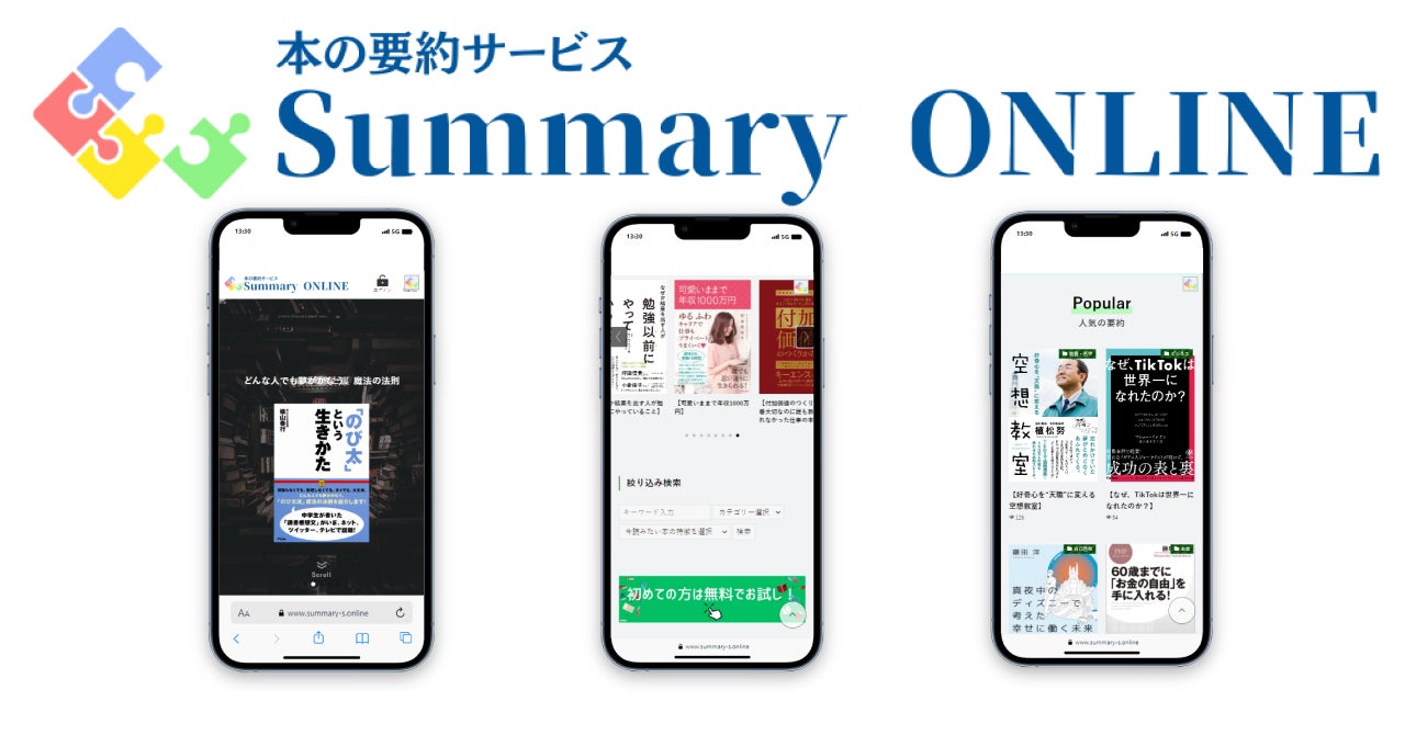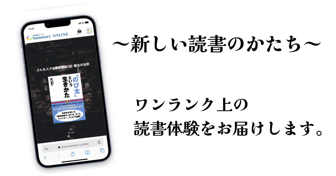 サマリーオンラインは、時短読書、本の購入前に内容を知ることでミスマッチを防ぐ「新しい読書のかたち」、新しい本との出会いなどを、誰もが楽しめるようにという思いで作られたサービスです。