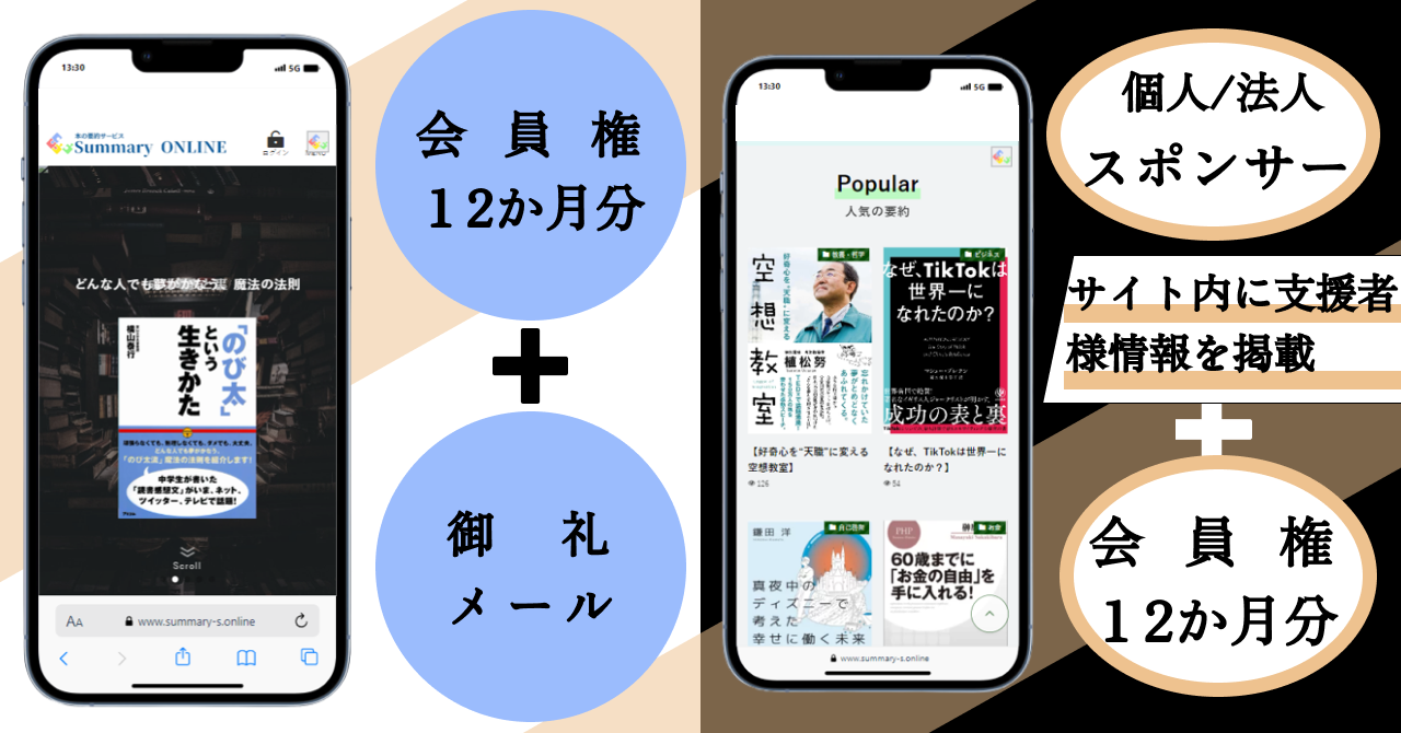 皆様と一緒になってサービスをつくっていけるよう、お得にサービスを利用できる会員権のほか、読書が好きな方、時短読書でインプットにまい進される方も多く利用する「サマリーオンライン」内に、ご支援者様の情報を掲載する「個人/法人スポンサー権」など、様々なリターンをご用意いたしました。