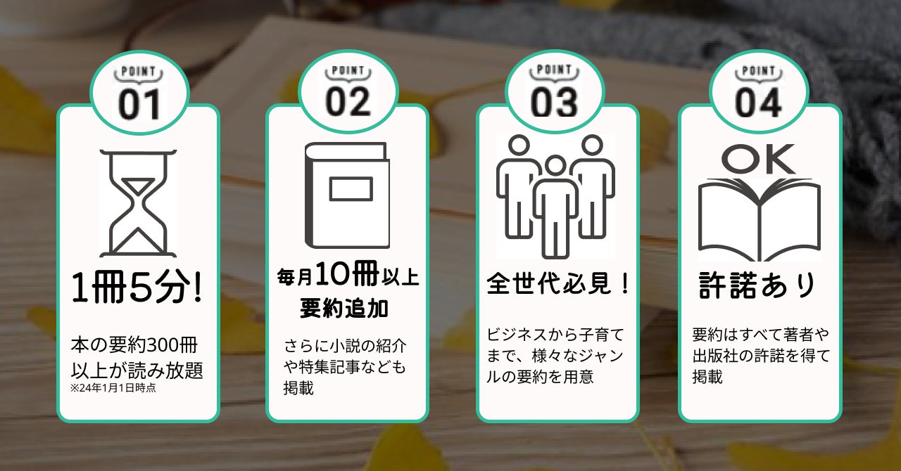 2024年1月1日にサービスを開始し、公開時の300冊に加え、毎月10冊以上の本の要約が追加されます。
