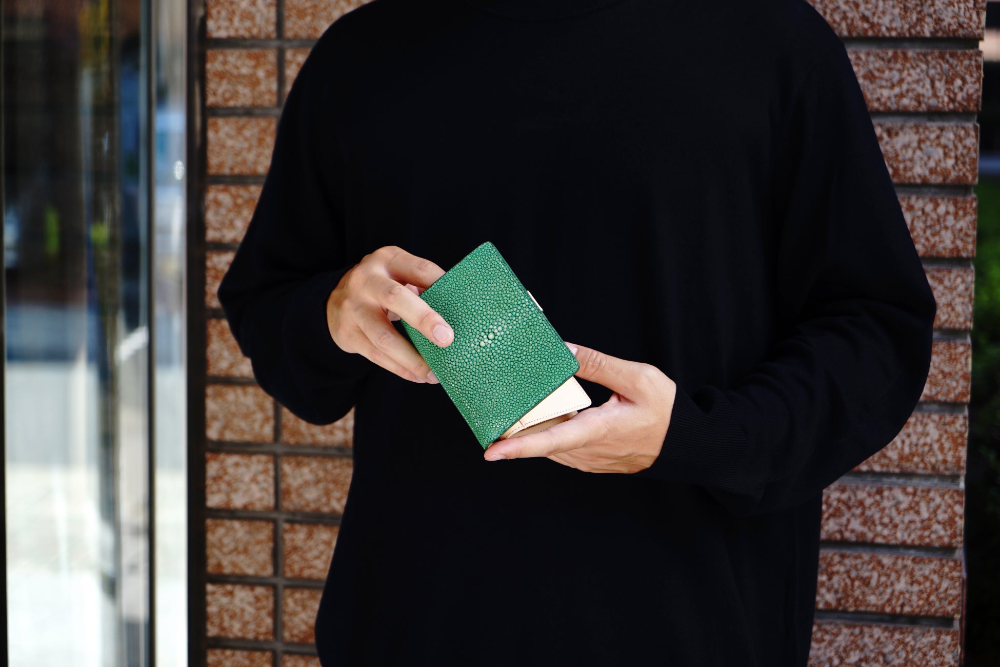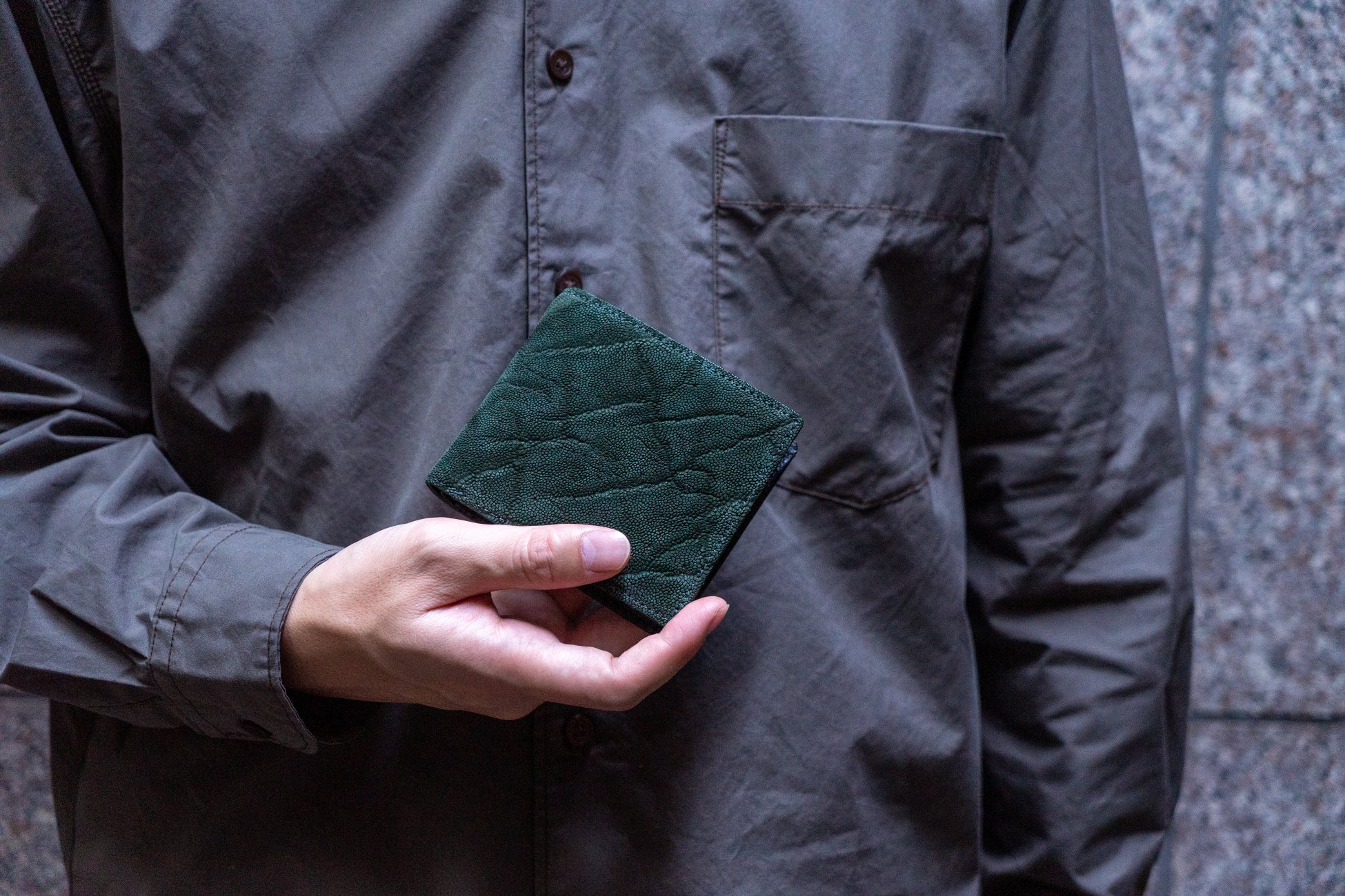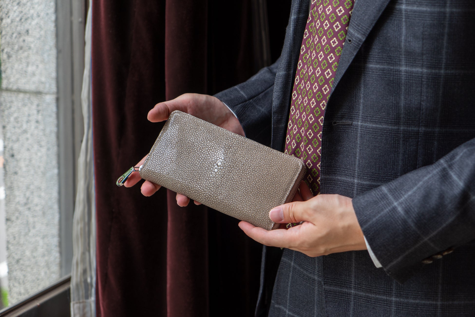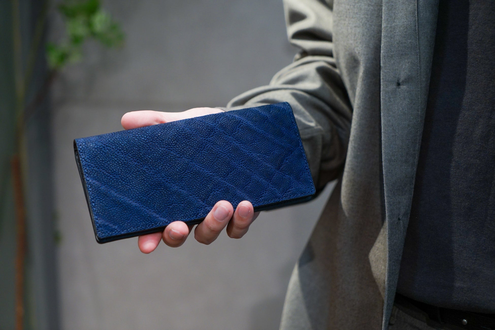 エイは古来よりラッキーフィッシュ(幸福の魚)として信仰されてきました。エイ革は独特の粒立った表面が美しく煌めく様から「海の宝石」とも称えられています。また華麗な見た目に加えて、水や汚れに強い特性や、牛革30年・エイ革100年と言われるほどの強い耐久性を併せ持ちます。