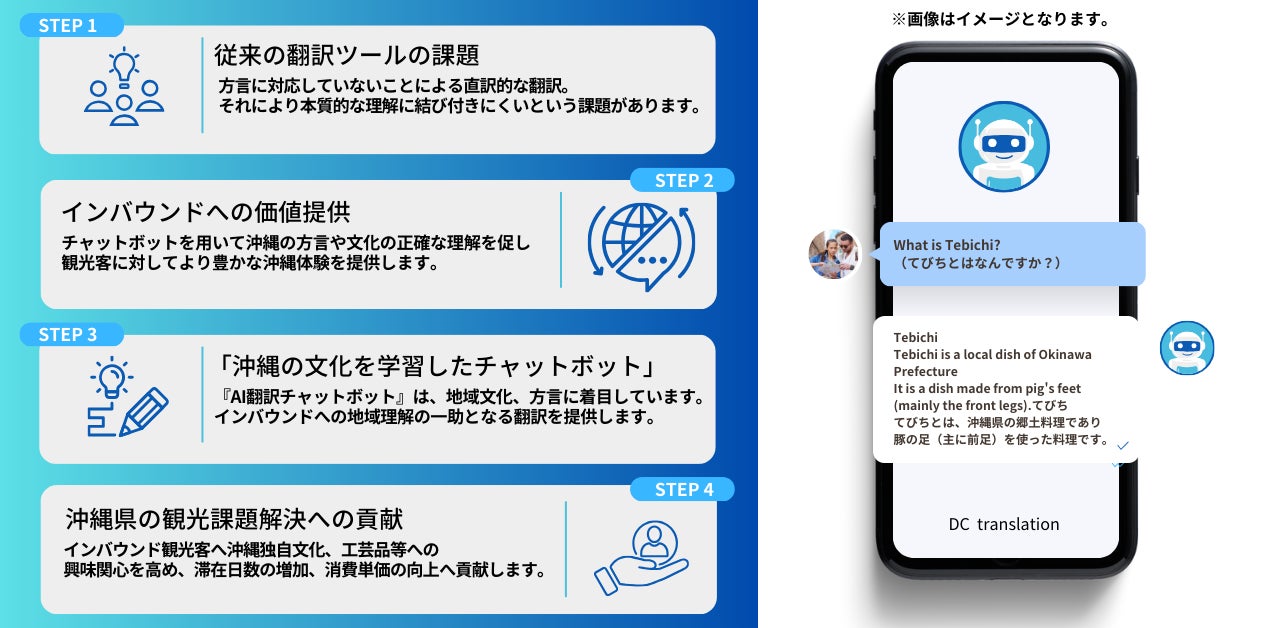 独自に開発したこのチャットボットは、従来の直訳的な翻訳ツールが方言に対応していないことに注目し、沖縄特有の言葉や文化を学習。これにより、インバウンド観光客に沖縄のより深い情報を提供し、沖縄体験をより本質的なものに向上させることを目指しています。
