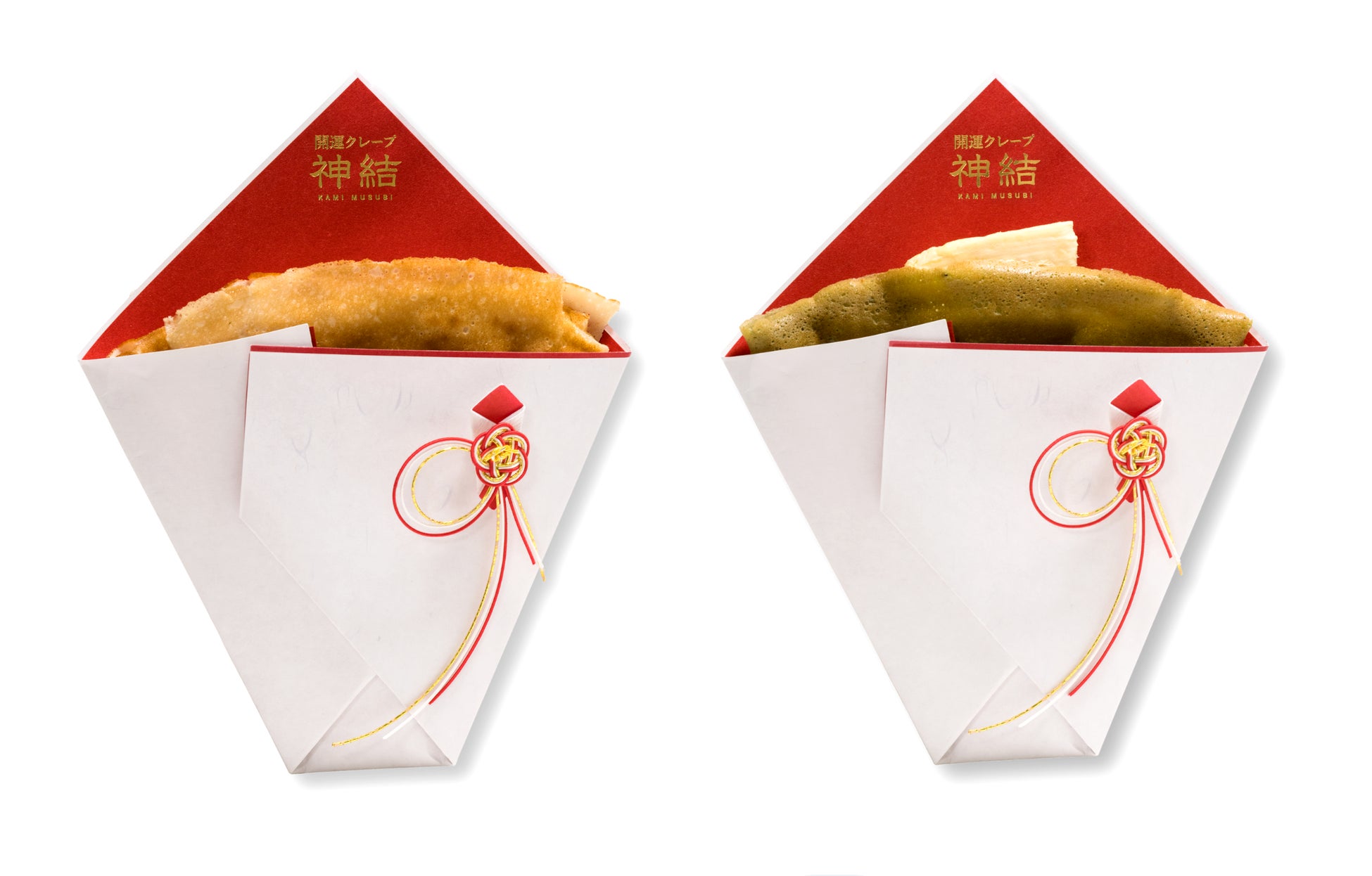神結はのし袋をイメージしたパッケージデザインと神饌をコンセプトとし、日本各地から取り寄せたこだわりの素材を使用した和クレープです。