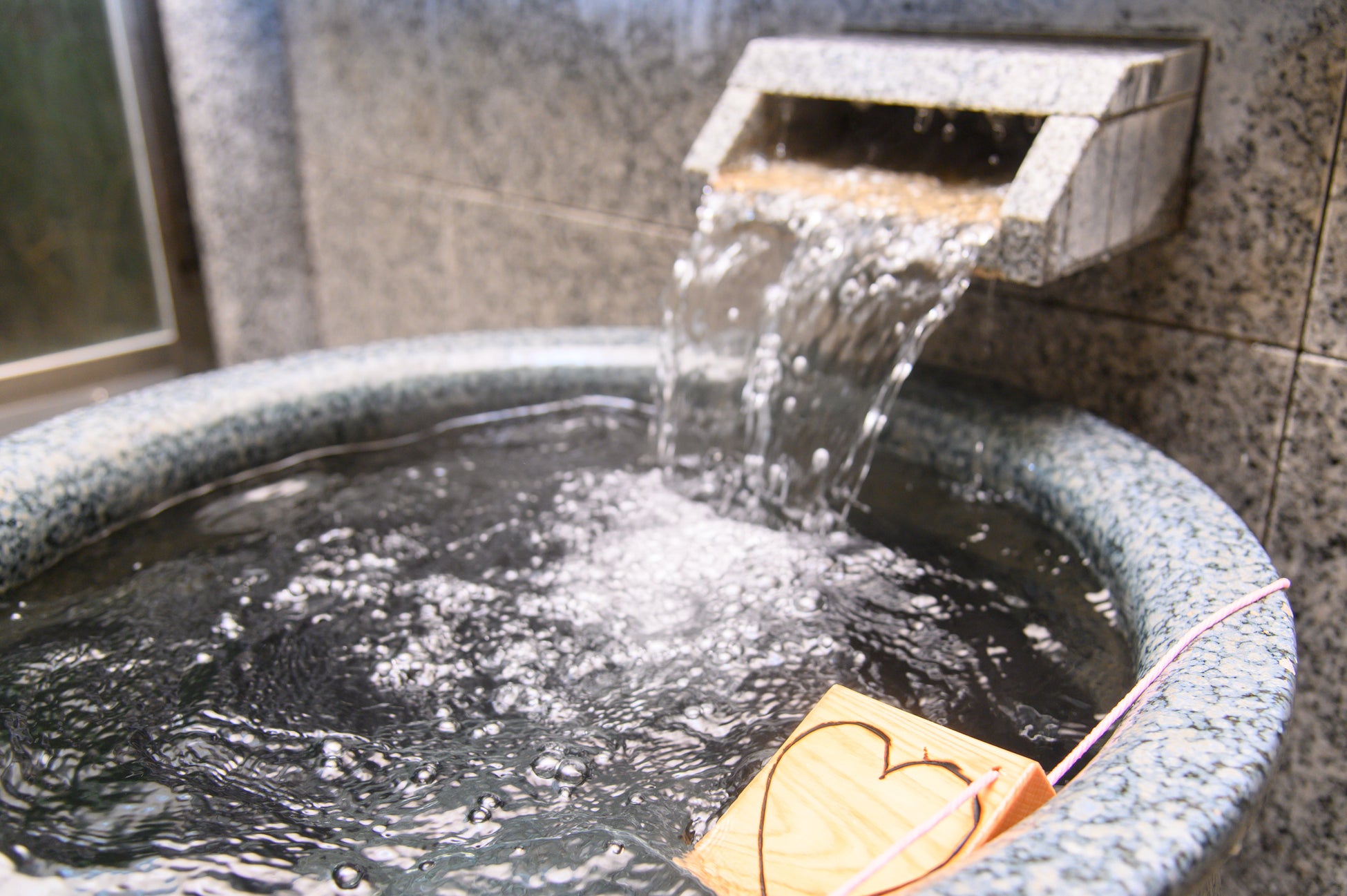↑恋木神社でご祈祷頂いたヒノキプレートを浮かべたかけ湯