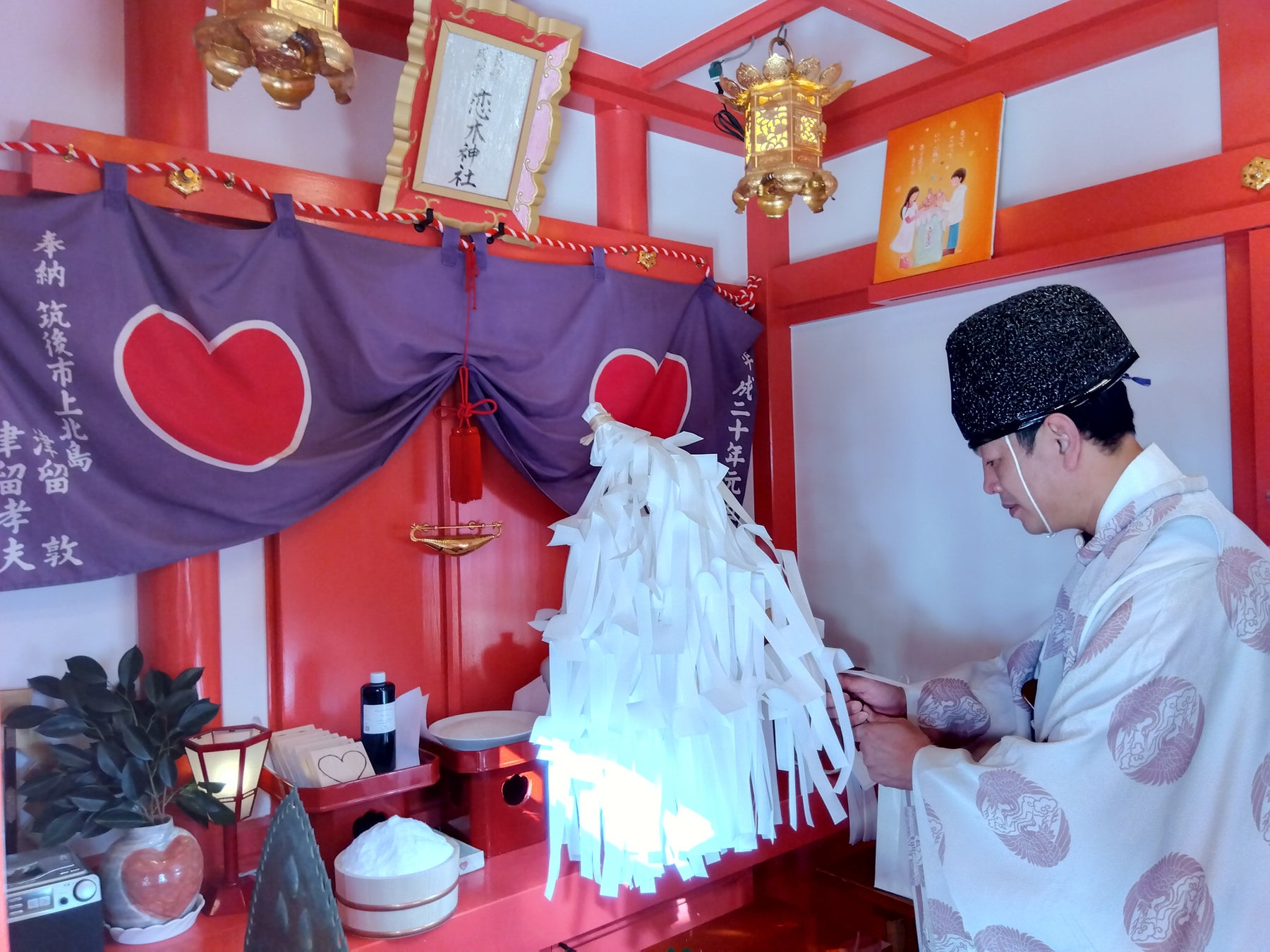 ↑塩、アロマ、ヒノキプレートのご祈祷の様子(恋木神社)