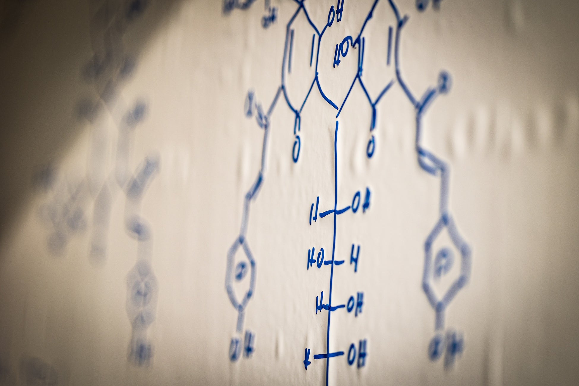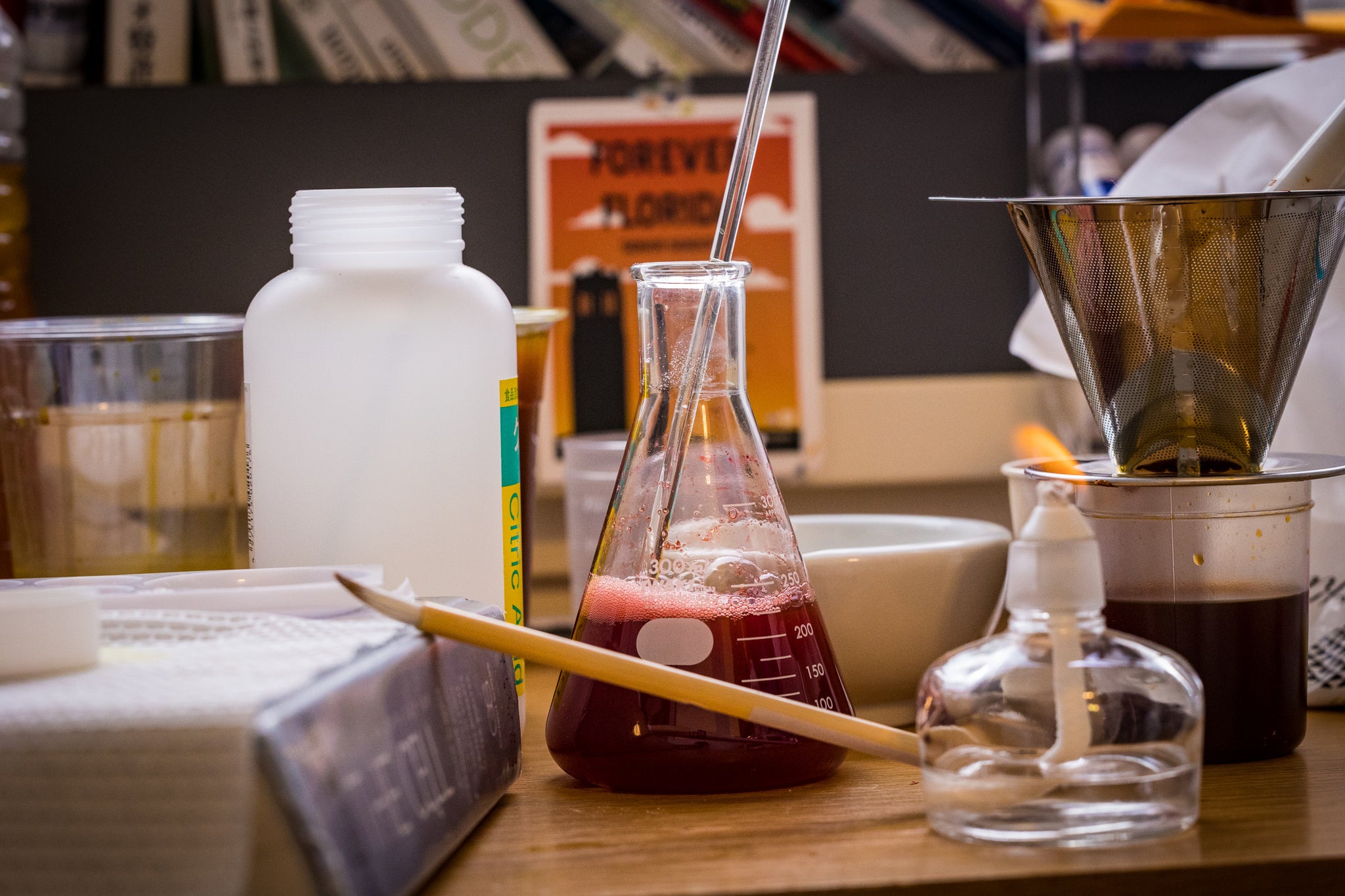 有楽町のスタジオ内部。試薬や専門書が並ぶデスク越しに「FOREVER FLORIDA」のロゴが見える。東京とフロリダを結ぶ本拠点を象徴する光景となっている。