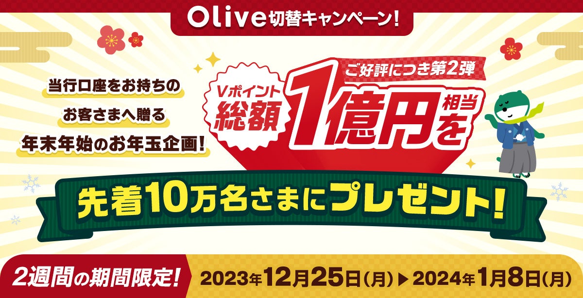 株式会社三井住友銀行(頭取CEO:福留 朗裕、以下「三井住友銀行」)は、すでに三井住友銀行口座をご利用されている皆さまに日頃のご愛顧に感謝を込めて「~総額1億円相当のⅤポイントを先着10万名さまにプレゼント!~Olive切替キャンペーン第2弾」を2023年12月25日(月)から2024年1月8日(月)の期間限定で実施いたします。