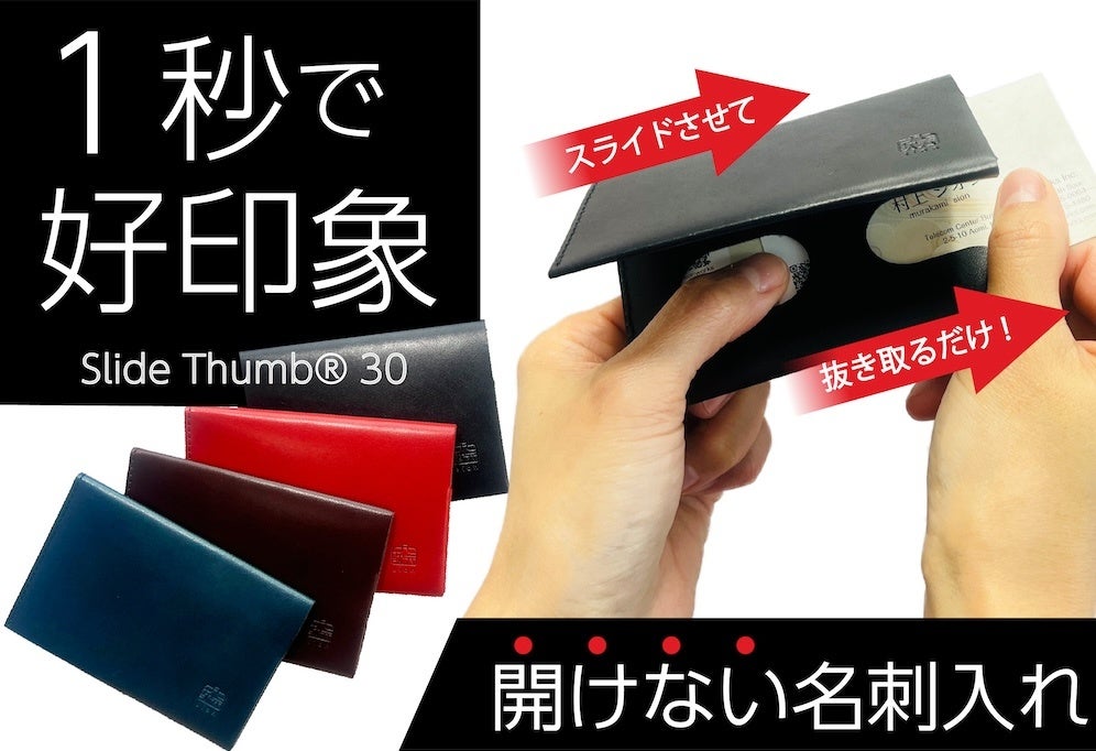 Slide Thumb®︎(スライドサム)は、蓋を開けずに親指(thumb)をスライドさせるだけで名刺を取り出せる名刺入れです。(意匠登録 第1722554号)