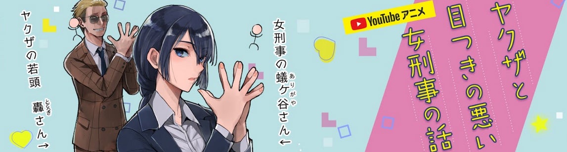 『ヤクザと目つきの悪い女刑事の話』(通称:ヤク目)は、原作者のSNS漫画から始まった、登録者56万人・総再生数2億超えのYouTubeアニメです。主人公は、日本最大勢力のヤクザ「土蜘蛛」若頭の「轟蛍一(とどろき けいいち)」と、マル暴の女刑事「蟻ヶ谷雪(ありがや ゆき)」。お互い好きなのに、素直な気持ちを伝えられないヤクザと女刑事のドタバタラブコメディ作品です。書籍化や人気YouTuberとのコラボも多数展開しています。