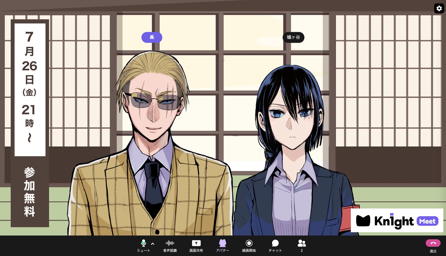 Qrow Pte. Ltd.(本社: シンガポール 支社: 東京新宿区)は、YouTubeアニメ『ヤクザと目つきの悪い女刑事の話』 (原作:晴十ナツメグ)と共同でアバター専用オンラインミーティング・ウェビナーツール「Kn1ght Meet(ナイトミート)」を使用したファンミーティング『土蜘蛛総会』を7月26日(金)21時より開催いたします。
