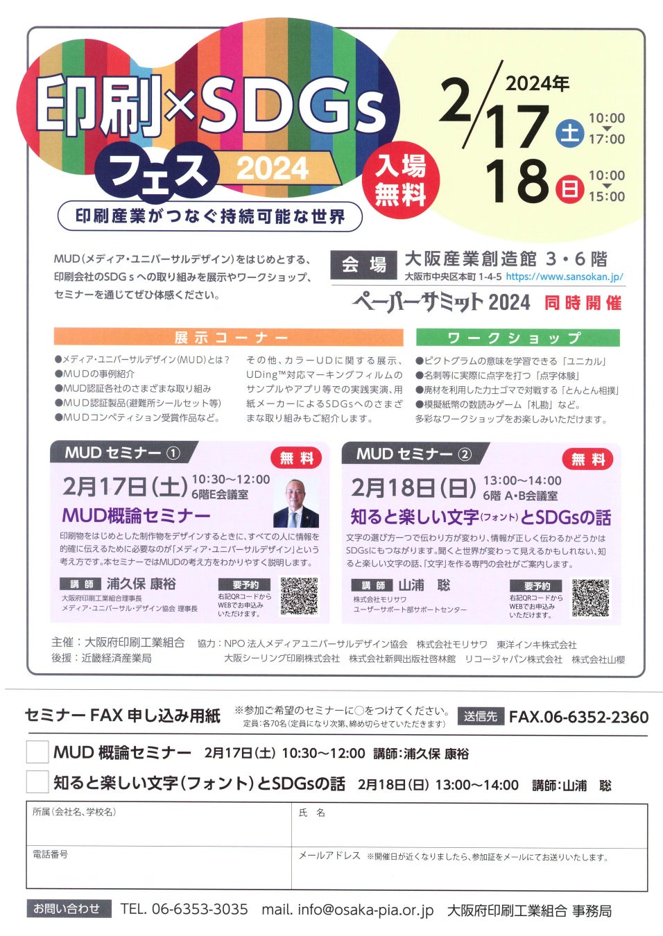 MUDをはじめする、印刷会社のSDGsへの取り組みを展示やワークショップ、セミナーを通じて紹介するイベント「印刷×SDGsフェス2024~印刷産業がつなぐ持続可能な世界~」を2024年2月17日(土)18日(日)の2日間、大阪産業創造館で開催します。本フェスは入場料・受講料は無料ですが、セミナーは事前申込制になっております。