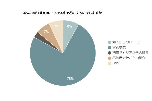 電気の切り替え時にどのように電力会社を探したか調査すると、「Web検索」が75%と一番多い結果となりました。