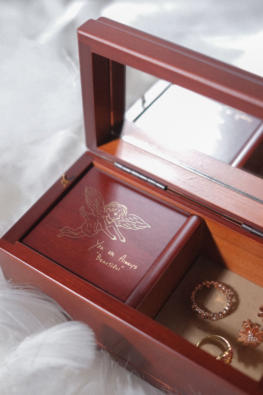 オルゴールを開くと、内側には岩橋から手に取った方へ届けたいと綴った直筆のメッセージと直筆の天使のイラストが刻まれ、温かい音色とともに、心に永遠の記憶を刻み込むでしょう。オルゴールの中にはアクセサリーの収納スペースがあり、あなただけの今までのTwO hundREDとの思い出を閉じ込めることができます。