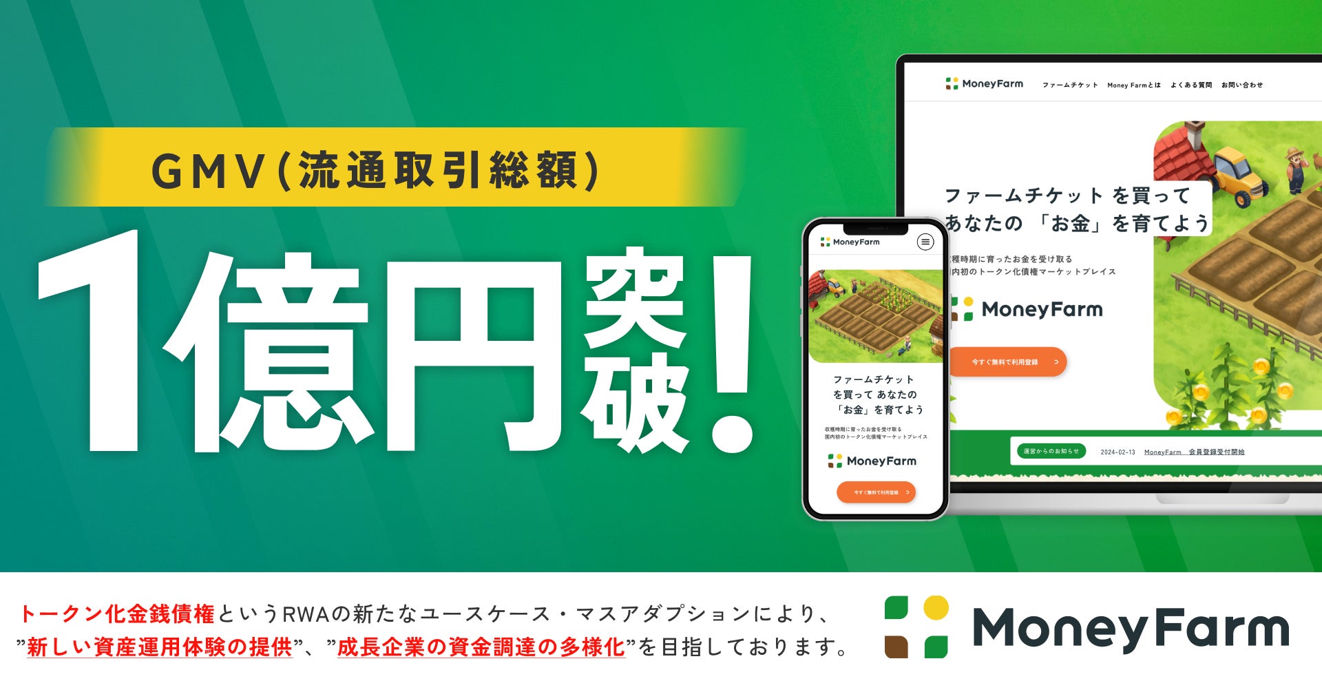 MoneyFarmは2024年3月21日よりファームチケットの販売を開始し、2024年7月1日を持ちましてMoneyFarmにおけるGMVが1億円を突破致しました。これまで51種類のファームチケットの販売(2024年7月1日時点)を経て1億円を突破し、販売開始101日目での1億円突破となりました。