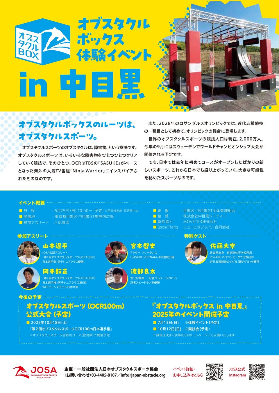 両者は5月25日に東京都目黒区で開催する『オブスタクルボックスデモイベント2025 in 中目黒』からパートナーシップをスタートさせます。このイベントはオブスタクルスポーツのジュニア向け施設であるオブスタクルボックスの認知拡大を目指して、オブスタアスリートによるデモンストレーションと、希望者が参加できる体験会で構成されます。