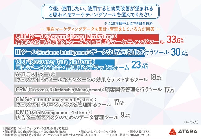 「今後、使用したい、使用すると効果改善が望まれると思われるマーケティングツールを選んでください」という質問に対しては「ABMツール(Account-Based Marketing):特定の企業や顧客をターゲットにしたマーケティングツール」が33.6%、「BIツール(Business Intelligence):データ分析と可視化を行うツール」が30.4%、「CDP(Customer Data Platform):顧客データを統合・管理するプラットフォーム」が23.4%と続きます。現在、使用しているマーケティングツールも、今後、使用したいマーケティングツールも、ともに「ABMツール」「BIツール」「CDP」が上位を占めました。