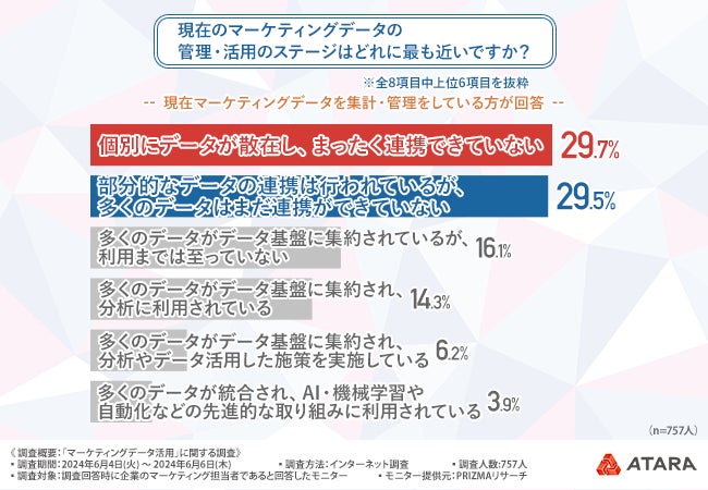 「現在のマーケティングデータの管理・活用のステージはどれに最も近いですか?」という質問に対しては「個別にデータが散在し、まったく連携できていない」が29.7%、「部分的なデータの連携は行われているが、多くのデータはまだ連携ができていない」が29.5%、「多くのデータがデータ基盤に集約されているが、利用までは至っていない」が16.1%と続きます。約3割の企業がデータの連携はまったくできていないことが明らかになりました。