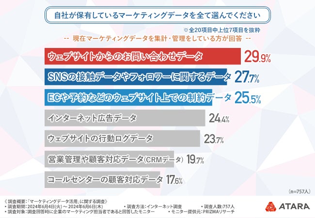 次に「自社が保有しているマーケティングデータを全て選んでください」と質問したところ「ウェブサイトからのお問い合わせデータ」が29.9%、「SNSの接触データやフォロワーに関するデータ」が27.7%、「ECや予約などのウェブサイト上での制約データ」が25.5%と続きます。ウェブサイトやSNSなどインターネット上で得られるデータが、それぞれ約3割で、上位を占めました。