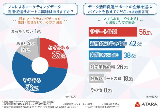 最後に「プロによるマーケティングデータ活用促進サポートに興味はありますか?」と質問したところ「とてもある」が27.0%、「ややある」が56.7%、「あまりない」が14.5%、「まったくない」が1.8%という結果になりました。「とてもある」(27.0%)と「ややある」(56.7%)の回答を合わせると83.7%で、8割以上の人がプロによるサポートに興味を示していることが明らかになりました。